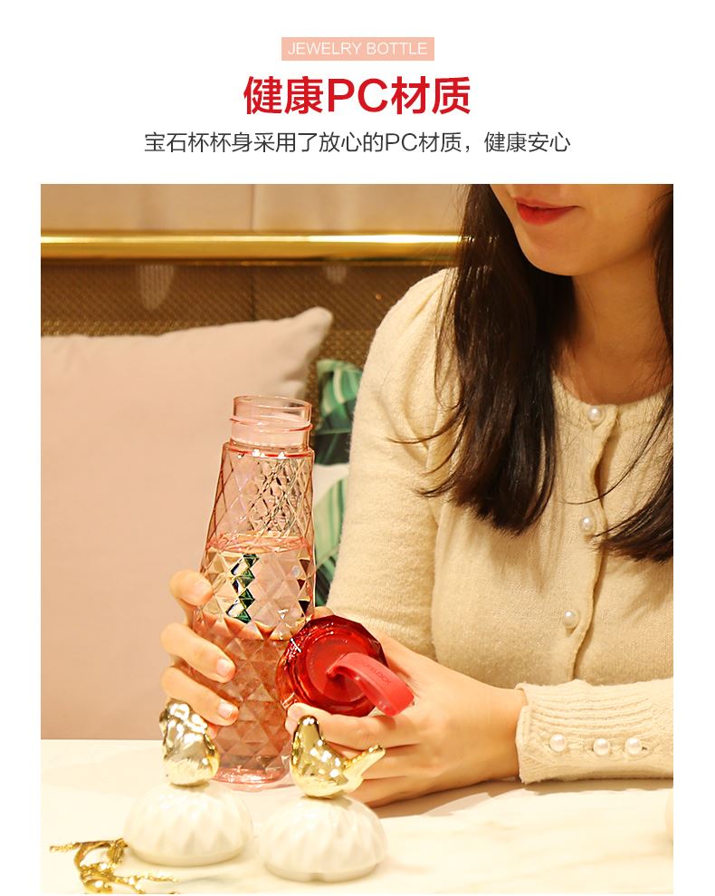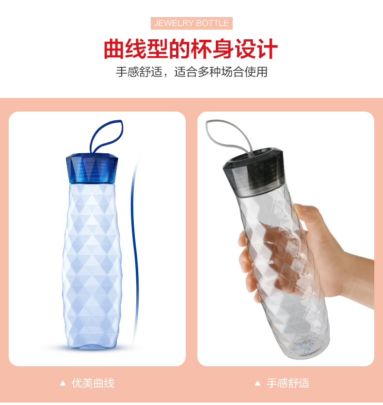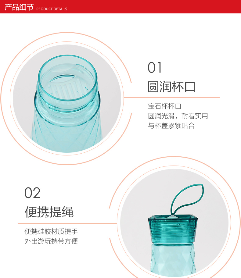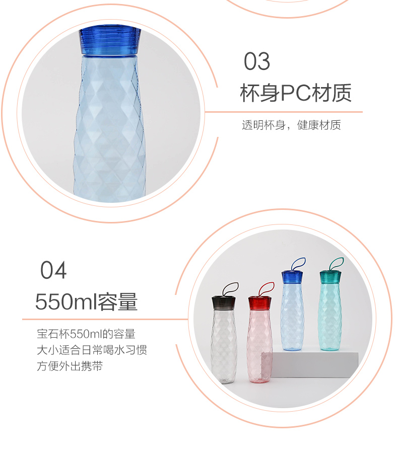材質(zhì):瓶體-PC 毫升:550ml 產(chǎn)品顏色:紅色 健康PC材質(zhì) 寶石杯杯身采用了放心的PC材質(zhì),健康安心。 曲線杯身設(shè)計(jì),手感舒適,適合多種場(chǎng)合使用。 可以拆卸食品用硅膠密封圈,采用的是硅膠成分,可以拆卸下來,方便清洗。 三款顏色多種選擇
