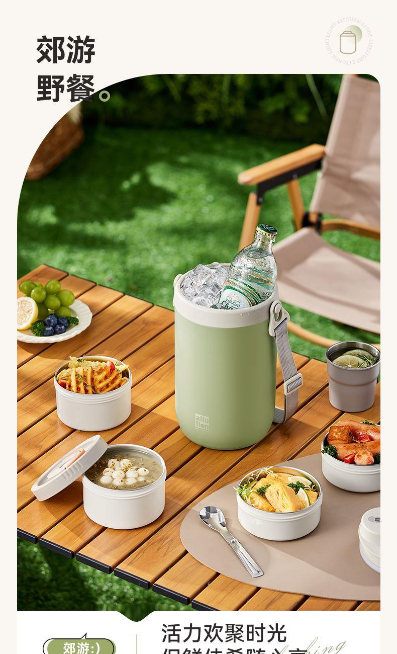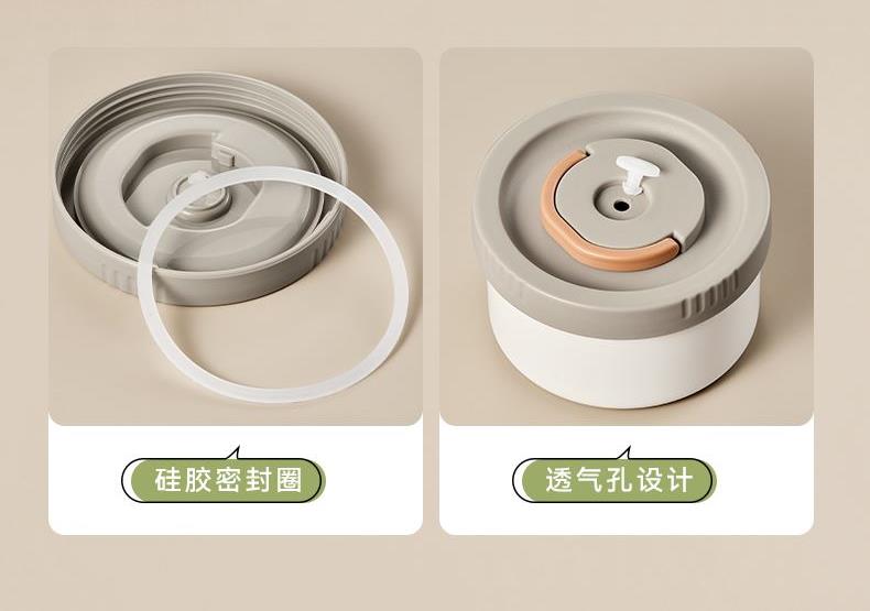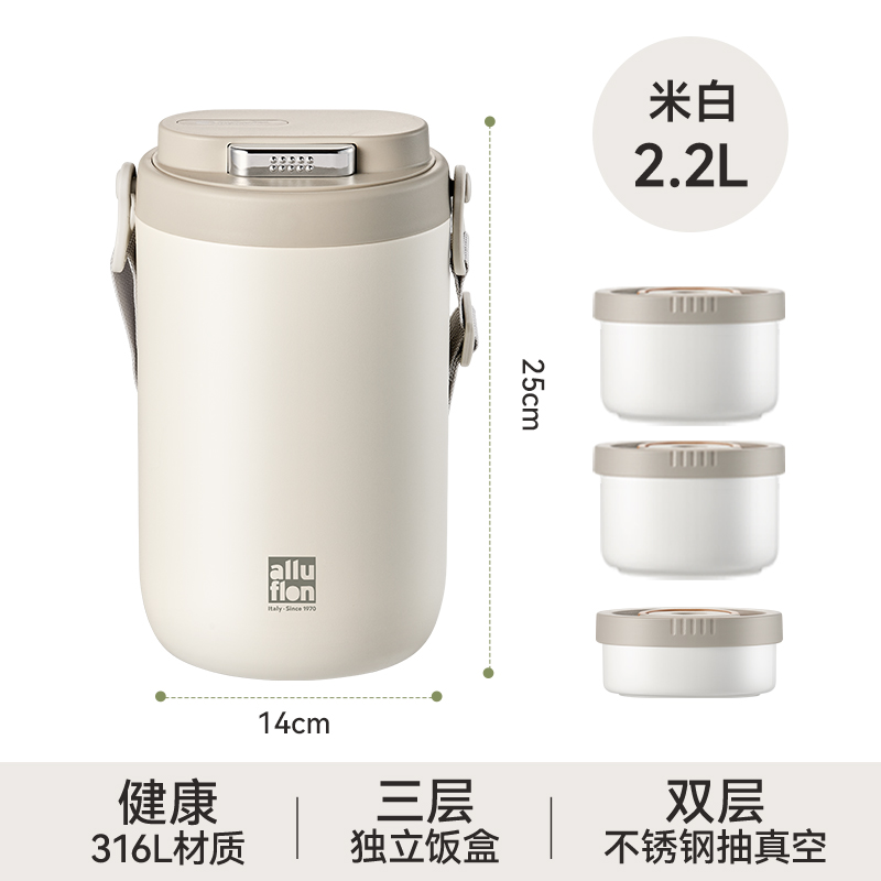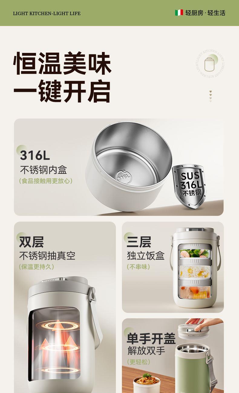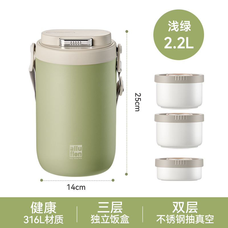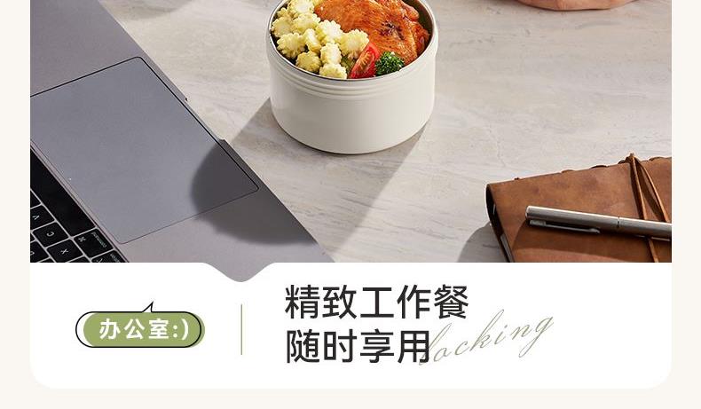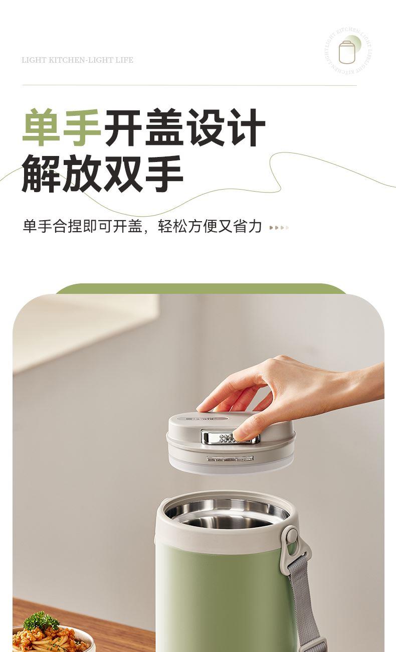 產(chǎn)品顏色:米白色/淺綠色 產(chǎn)品貨號:2201032423 外箱尺寸:555*360*550mm 彩盒尺寸:162X162X255mm 1、健康316L材質(zhì),食品接觸使用更放心 2、三層獨(dú)立飯盒,菜飯湯分離不串味 3、雙層不銹鋼抽真空,保溫更持久 4、內(nèi)置硅膠密封圈,倒置防漏 5、單手開蓋設(shè)計(jì),方便又省力