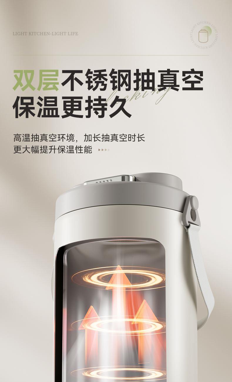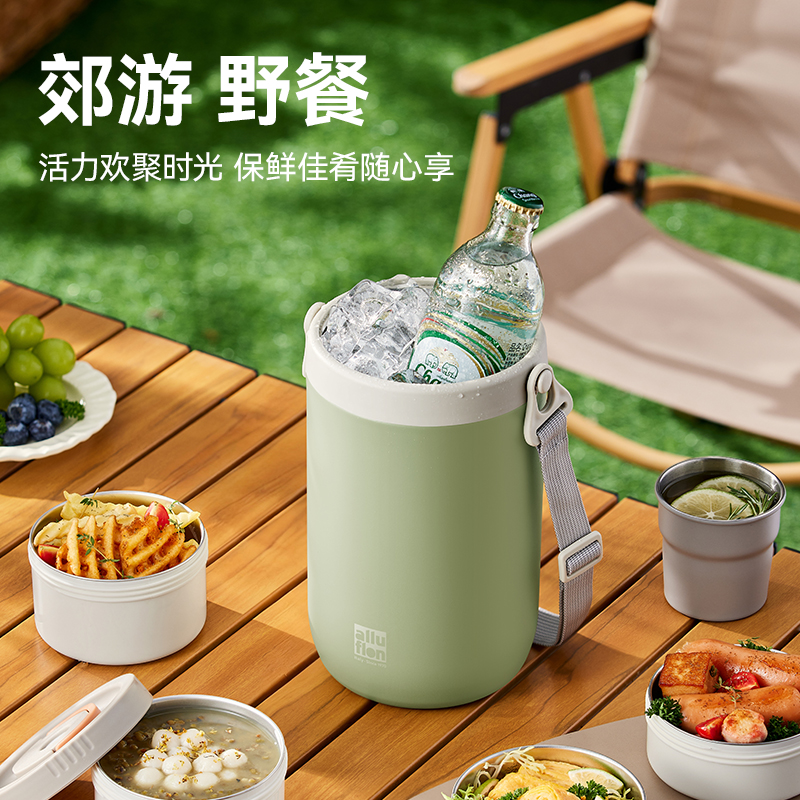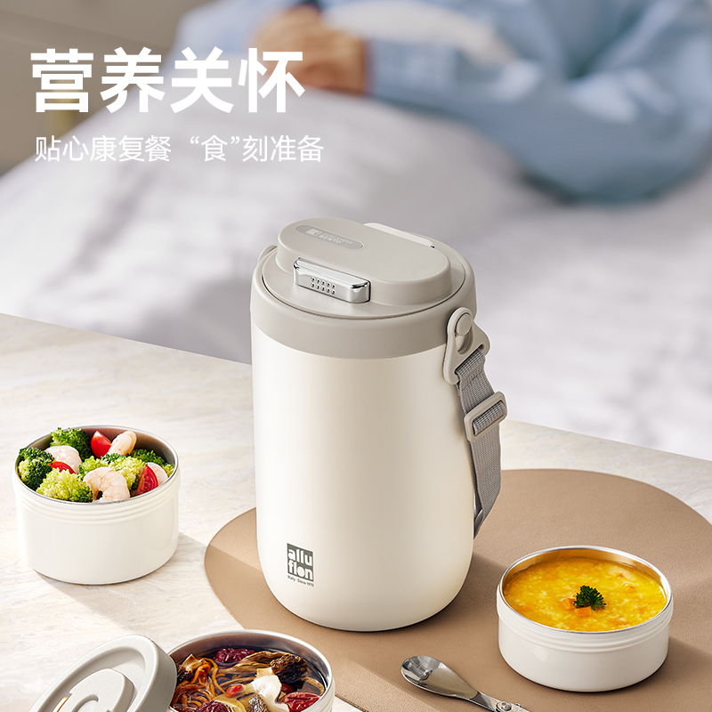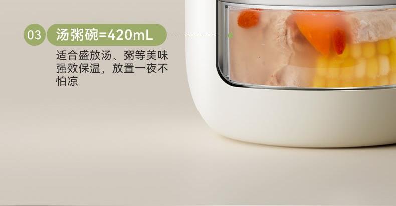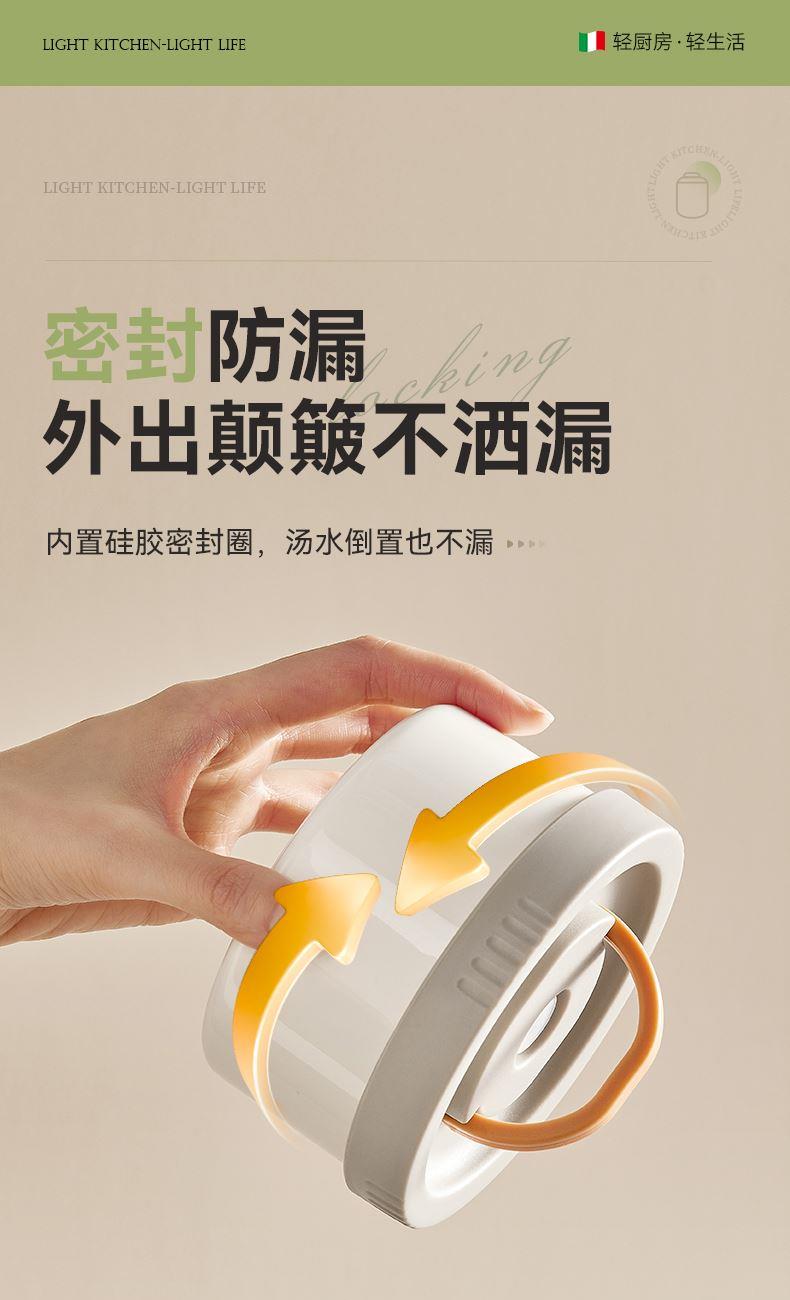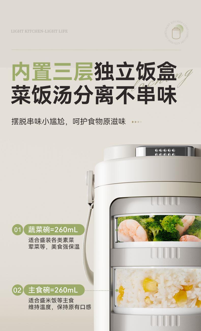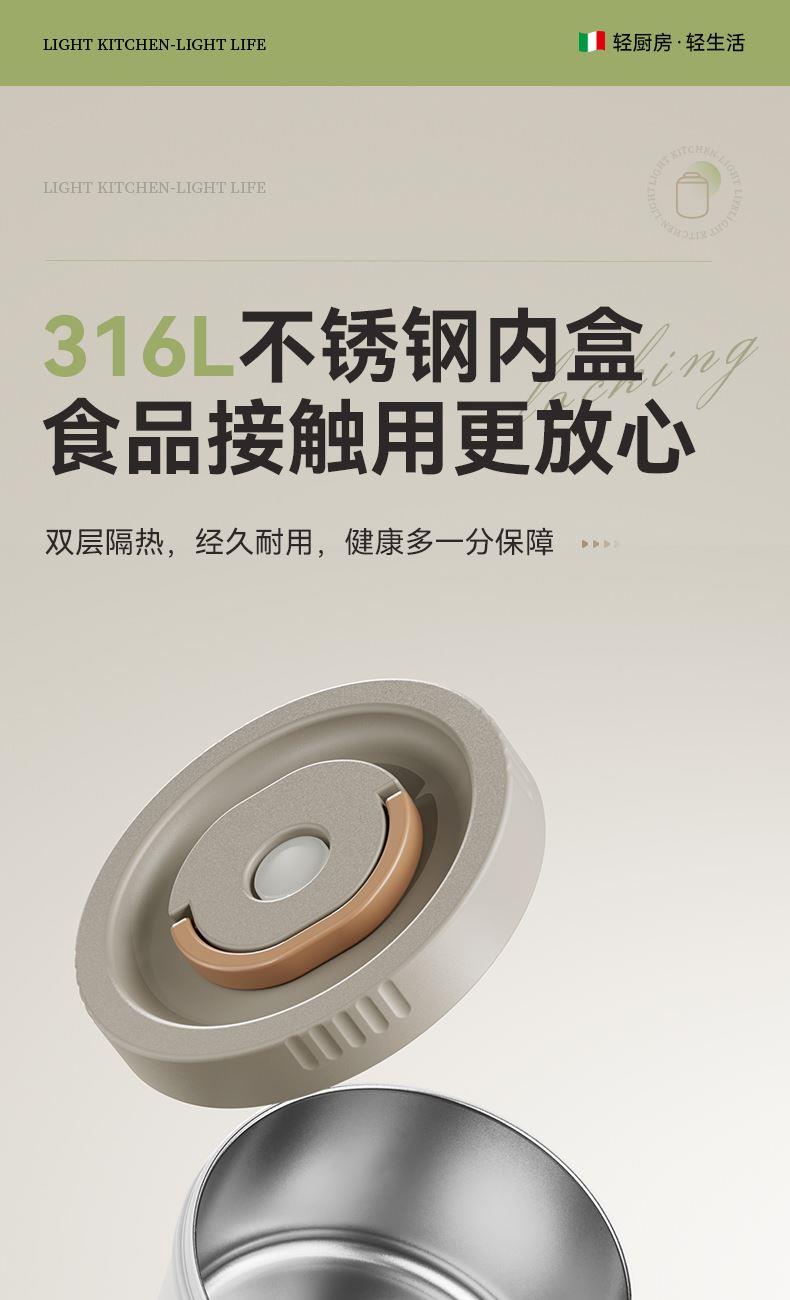產(chǎn)品顏色:米白色/淺綠色 產(chǎn)品貨號:2201032423 外箱尺寸:555*360*550mm 彩盒尺寸:162X162X255mm 1、健康316L材質(zhì),食品接觸使用更放心 2、三層獨(dú)立飯盒,菜飯湯分離不串味 3、雙層不銹鋼抽真空,保溫更持久 4、內(nèi)置硅膠密封圈,倒置防漏 5、單手開蓋設(shè)計(jì),方便又省力