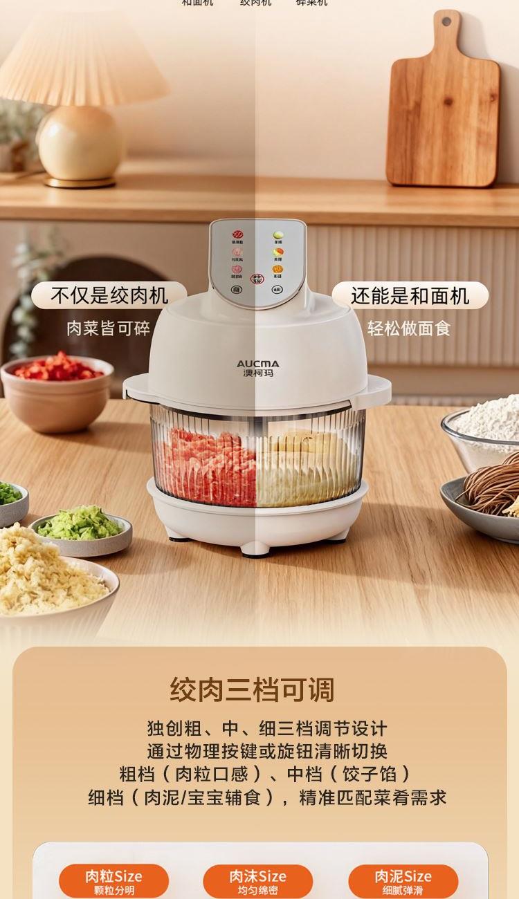 粗中細(xì)三檔可調(diào),多功能集成;三檔肉粒 + 和面拌菜打蛋,一臺(tái)搞定;