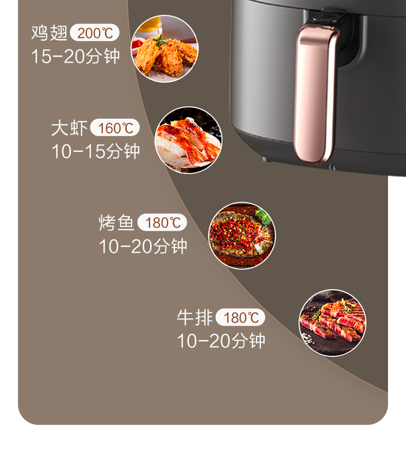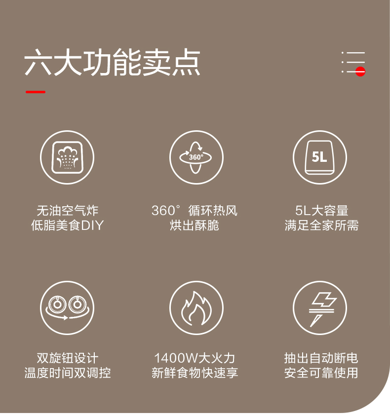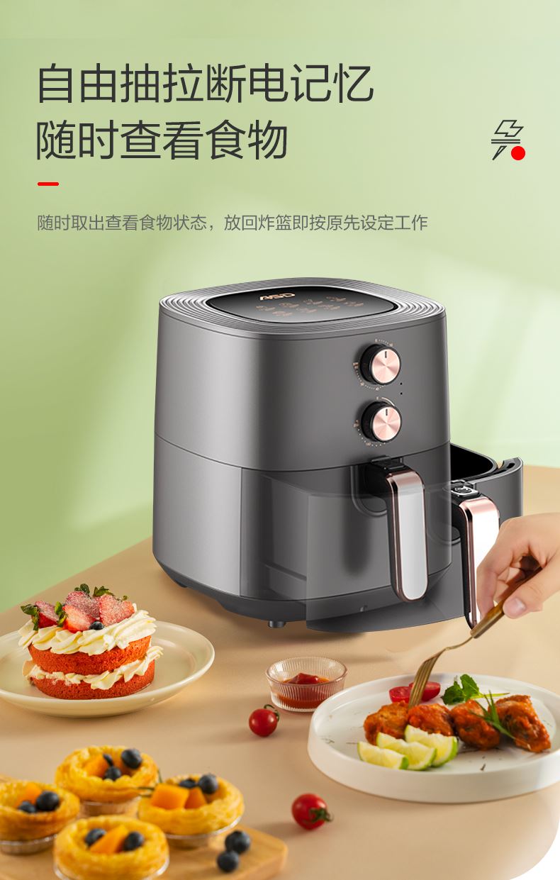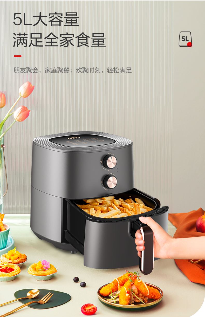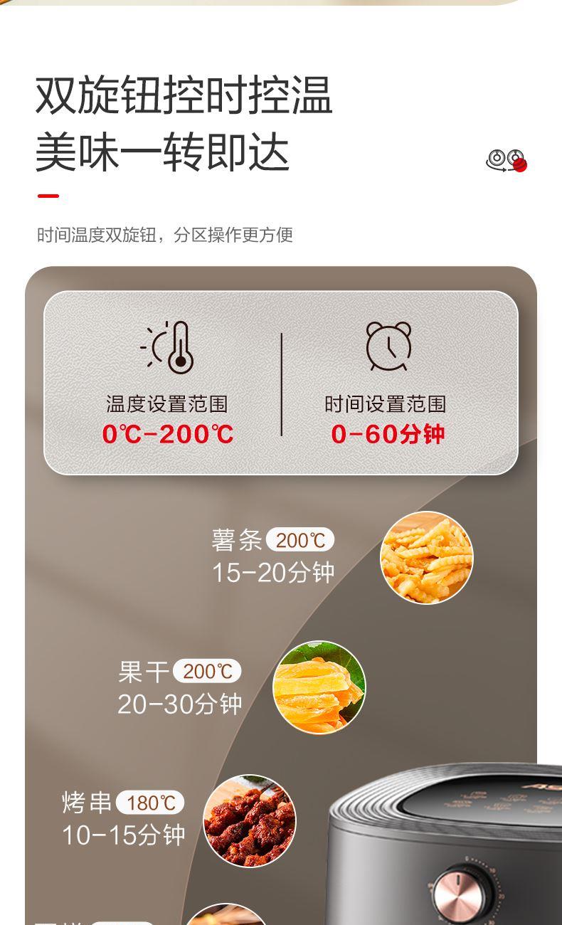 產(chǎn)品型號:AK-F50J707 產(chǎn)品功率:1400W 產(chǎn)品容量: 5L 包裝尺寸355*355*360mm 額定電壓220V~50Hz 產(chǎn)品凈重:4.2KG 1、無油空氣炸低脂美食DIY,360°循環(huán)熱風。 2、烘出酥脆,5L大容量,滿足全家所需。 3、雙旋鈕設計,溫度時間雙調(diào)控。 4、1400W大火力新鮮食物快速享。 5、抽出自動斷電安全可靠使用。