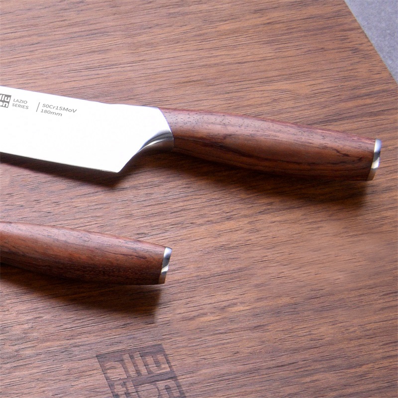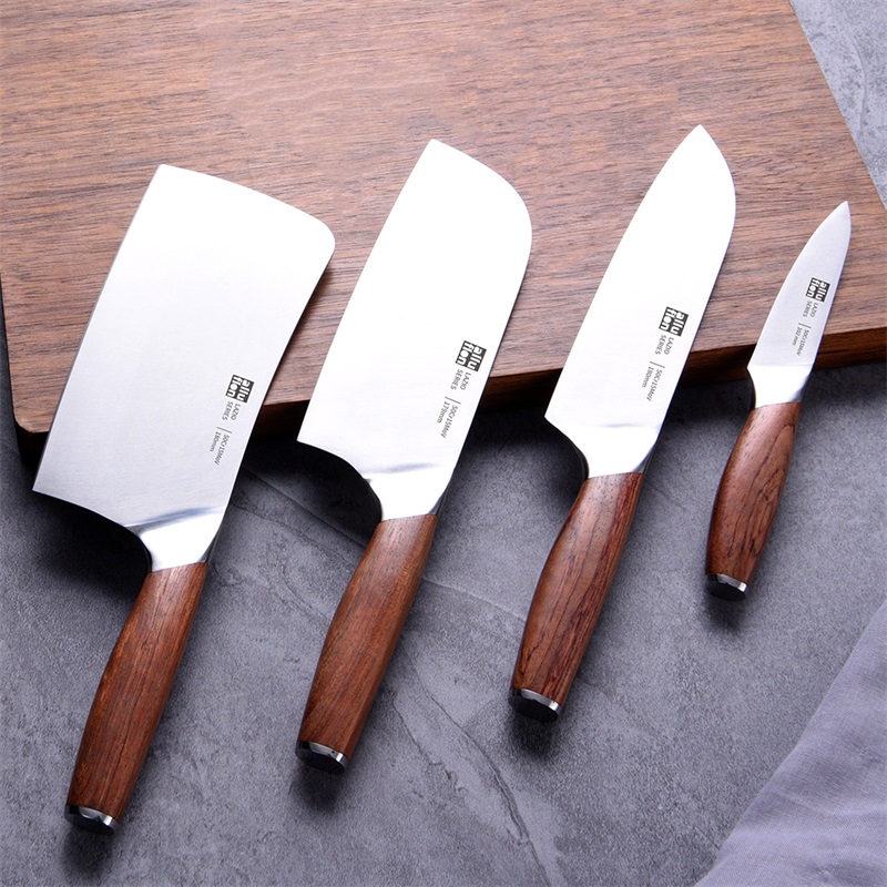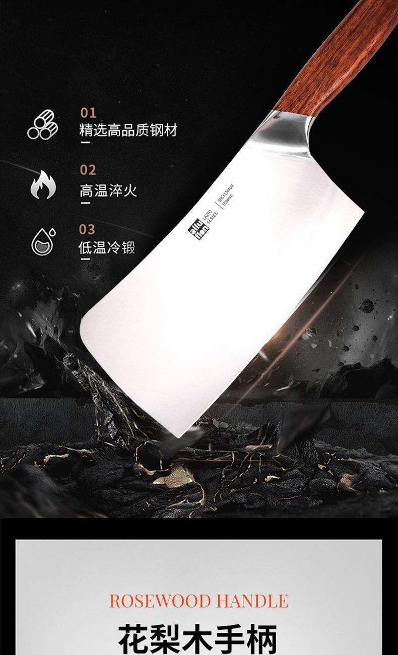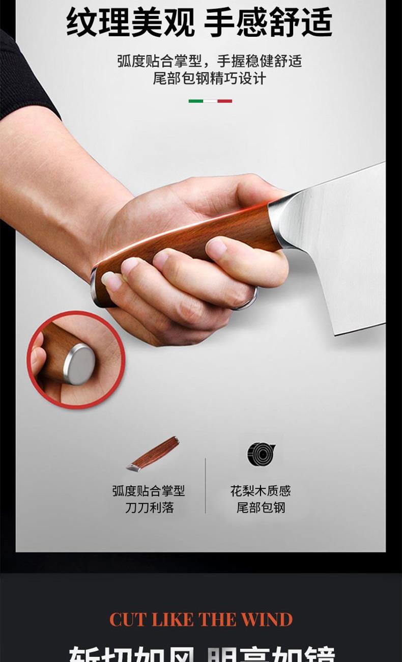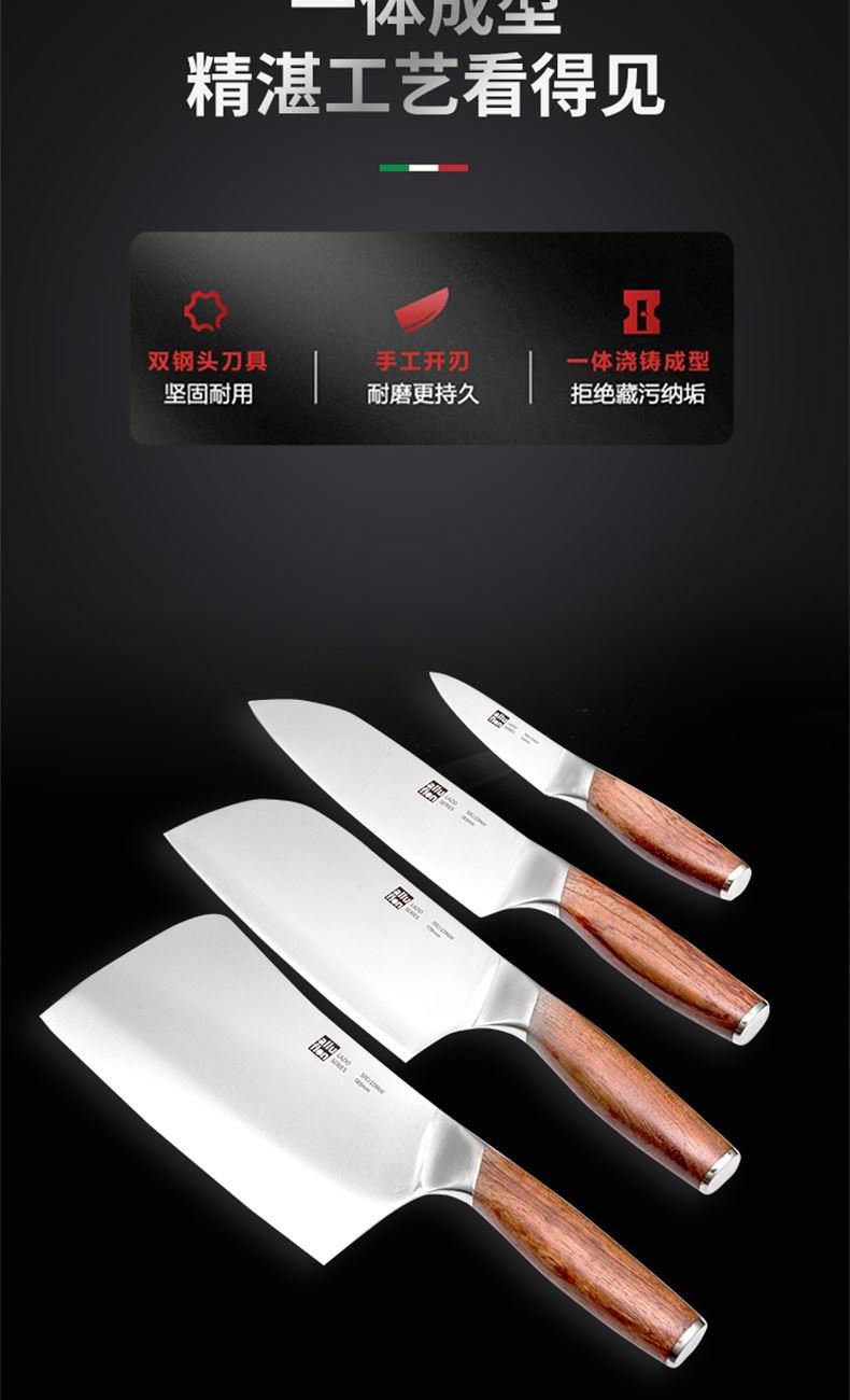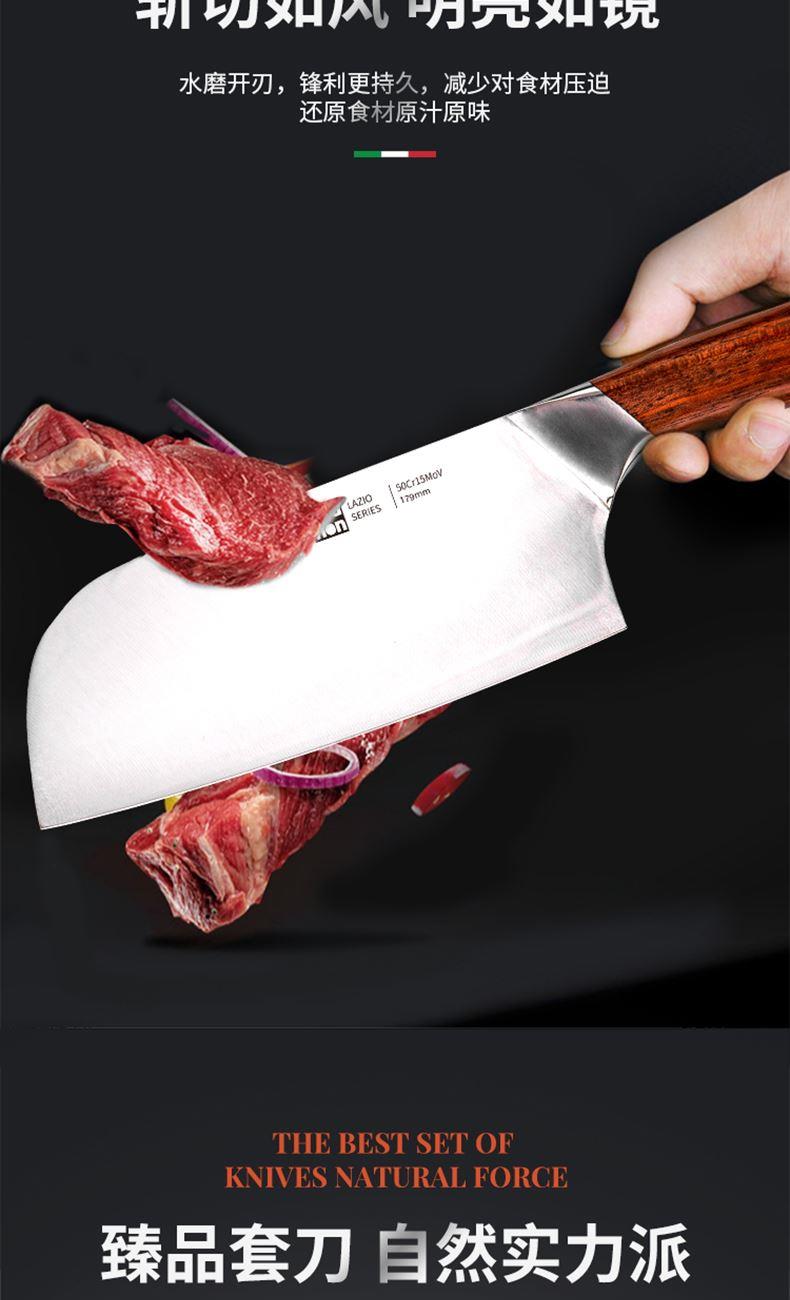 規(guī)格:六件套(切片刀、砍骨刀、三德刀、 水果刀、剪刀、刀座) 材質(zhì):50Cr15MoV鋼、花梨木 單個(gè)尺寸:250*143*350 1、50Cr15MoV,高硬度 2、冷鍛處理,鋼材結(jié)構(gòu)穩(wěn)定 3、花梨木手柄,紋理精美 4、臻品套刀,專刀專用。