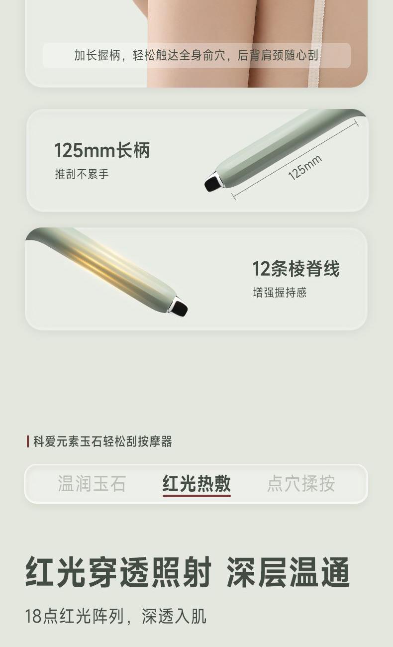 2、平緩山型設(shè)計是根據(jù)皮膚肌理設(shè)計得,特別適合刮臉部和身體。長把手好用力,大小剛好刮三下就能把半邊臉都覆蓋,而且刮在臉上特別的絲滑,還可以用來刮身體,一機多用