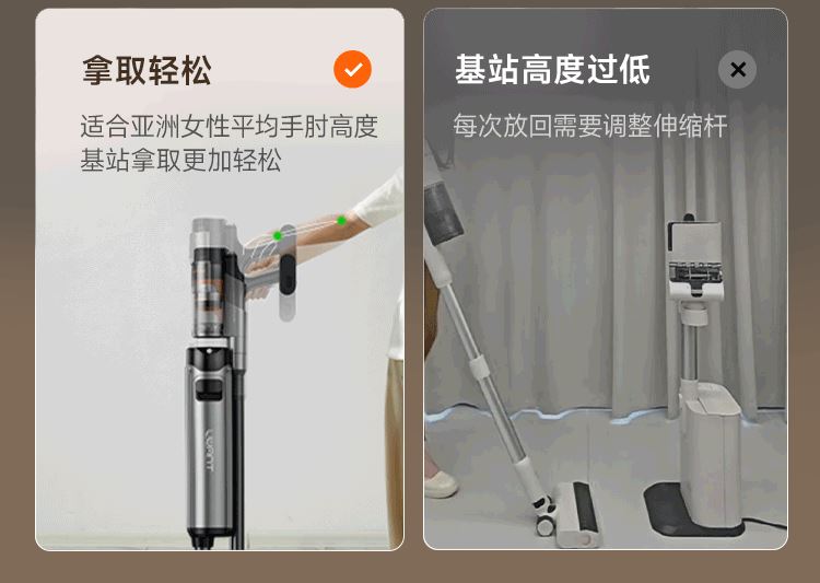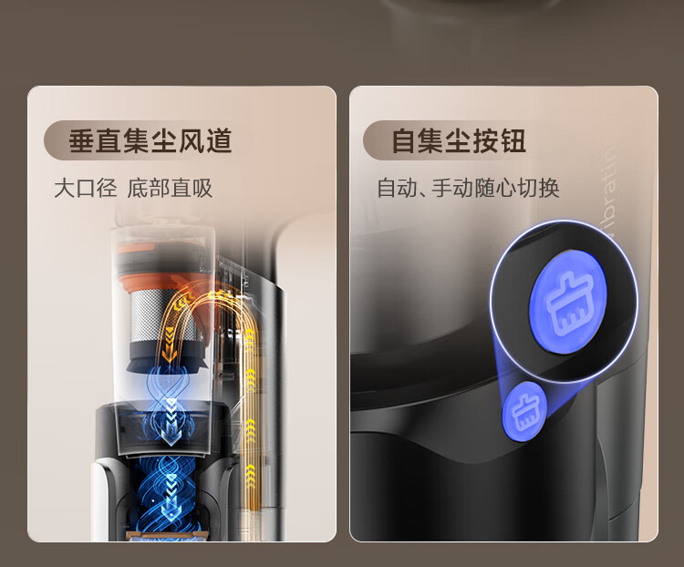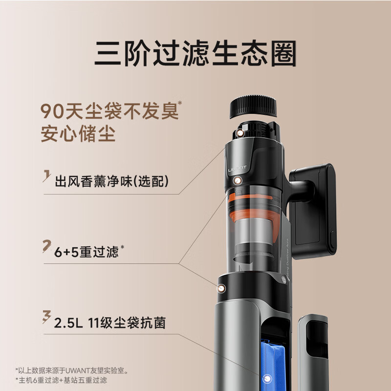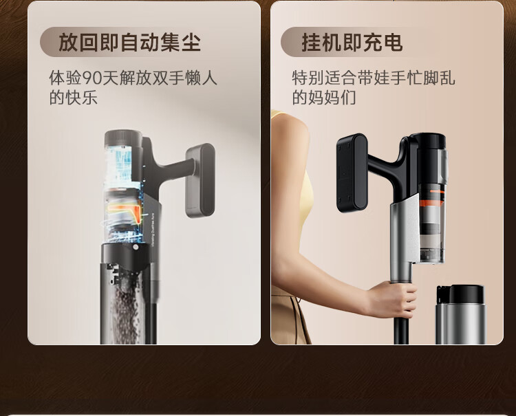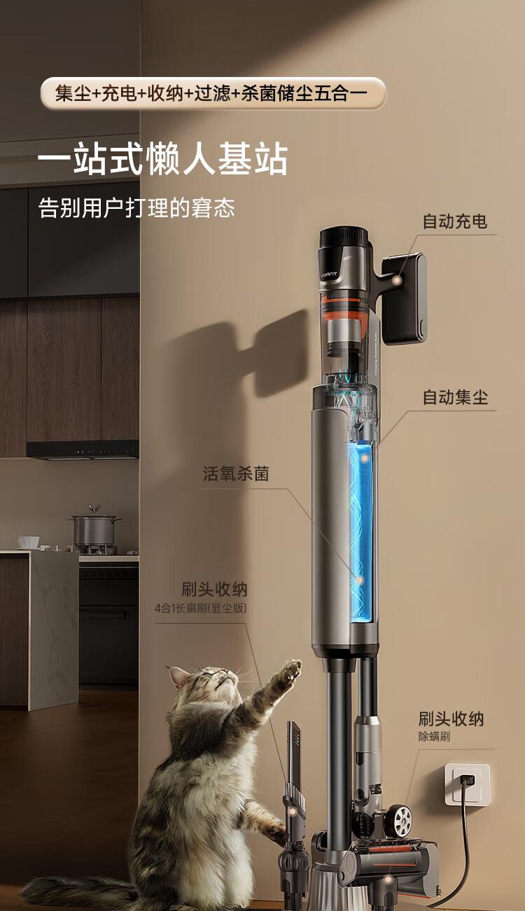 2.基站(收納+充電+集塵三合一),自動倒灰,不用手動清理塵盒。