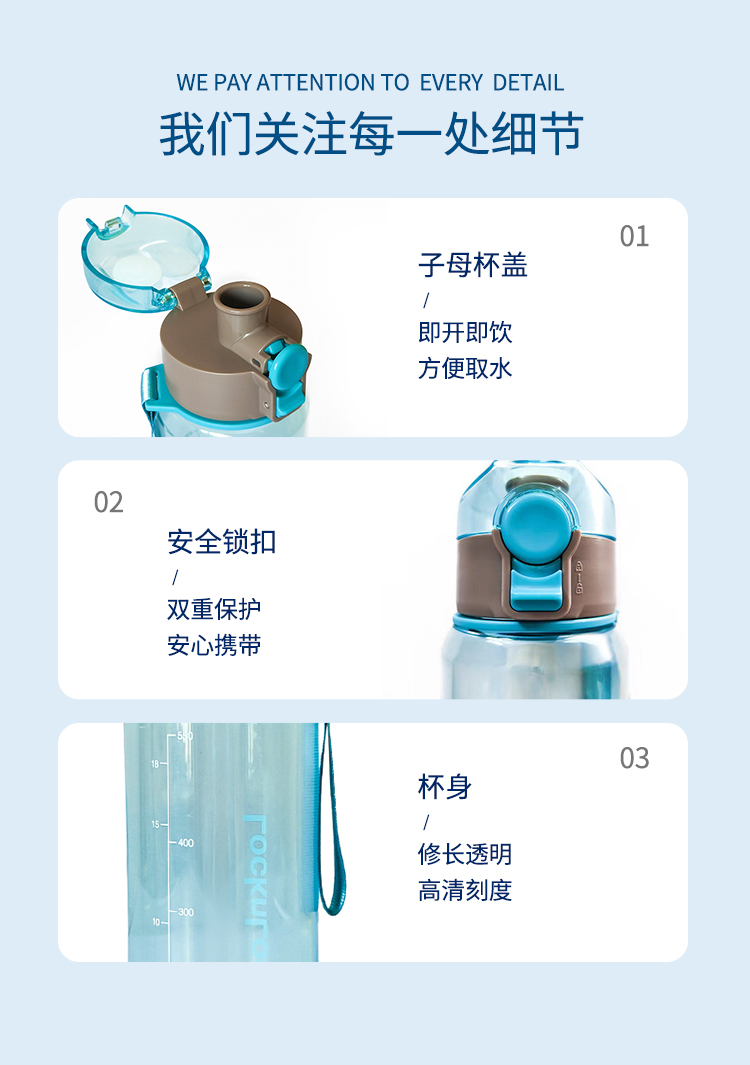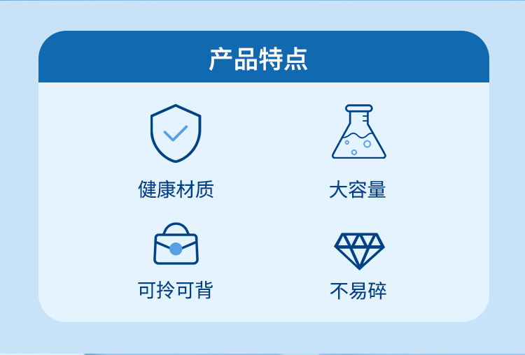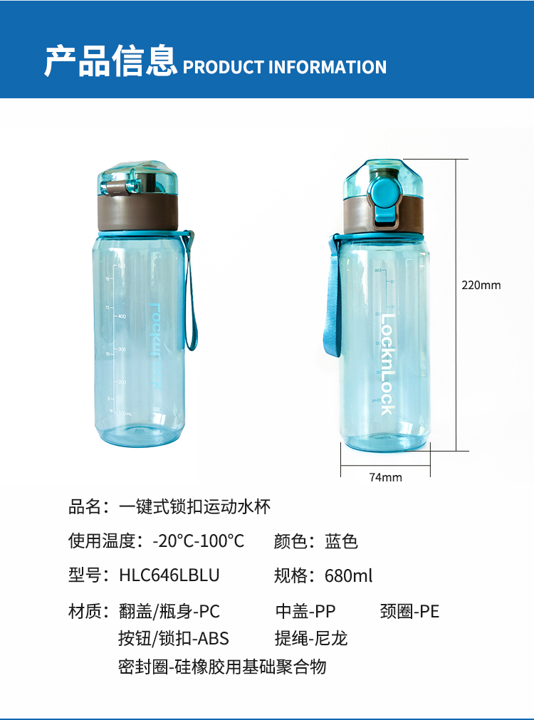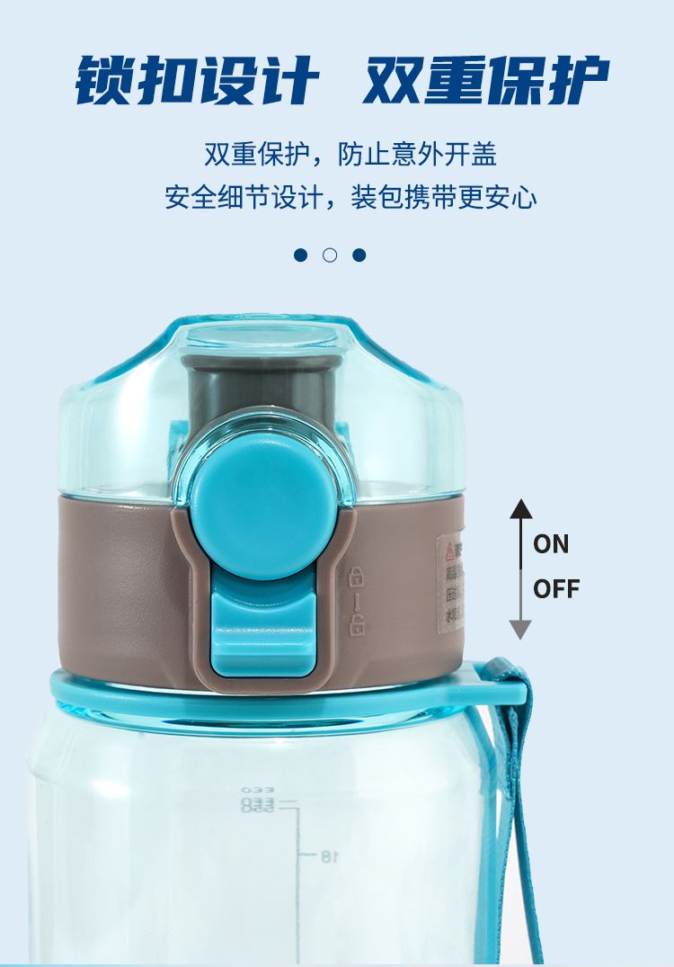 材質(zhì):瓶蓋-PP+PC / 瓶身-PC 容量:680ml 產(chǎn)品顏色:藍(lán)色 一鍵式彈簧蓋設(shè)計(jì),單手喝水簡(jiǎn)潔方便衛(wèi)生 硅膠密封防漏,防意外觸碰鎖扣 便捷提繩,外出說(shuō)走就走 小口飲水,大口倒茶,680ml大容量 PP健康材質(zhì),耐磨耐摔耐高溫