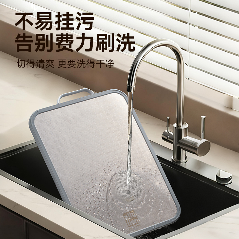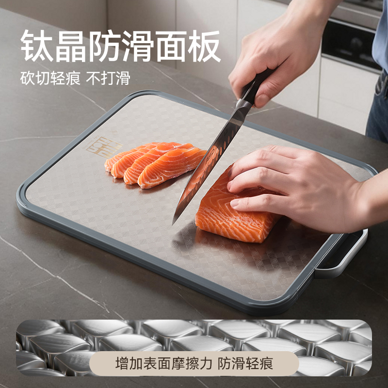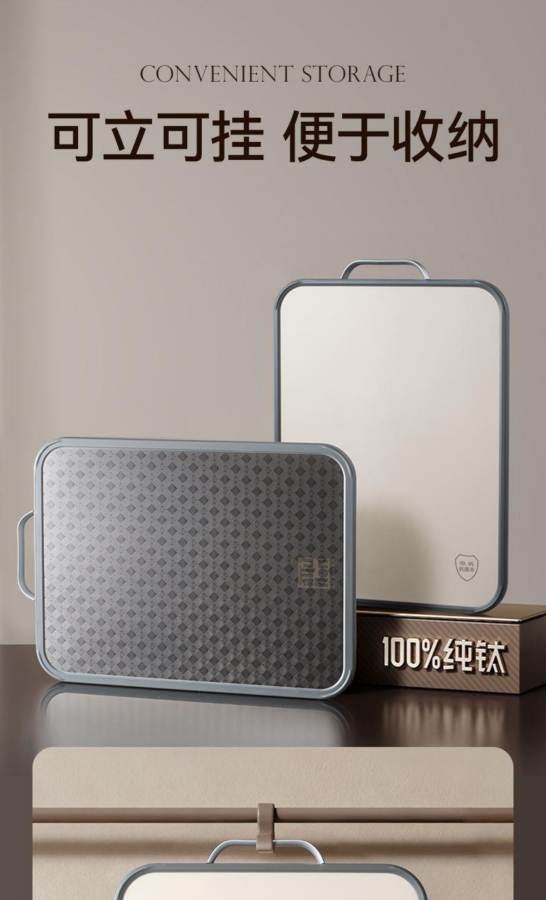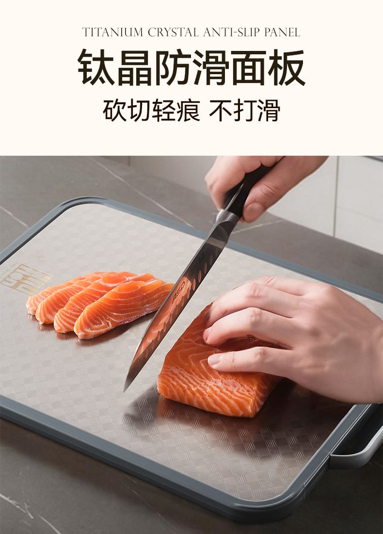產(chǎn)品規(guī)格:37*28*1.5cm 產(chǎn)品貨號(hào):2205085128 外箱尺寸:425*295*210mm 彩盒尺寸:285*250*420mm 1、純鈦砧板,健康無(wú)污染 2、高硬度防滑擦,耐砍輕痕 3、雙面鮮切,生熟分區(qū) 4、3.0PP面,有效防止細(xì)菌滋生 5、可立可掛,收納便捷