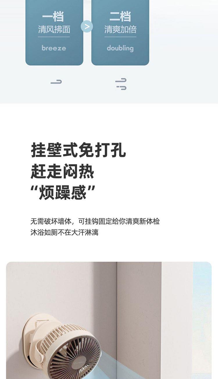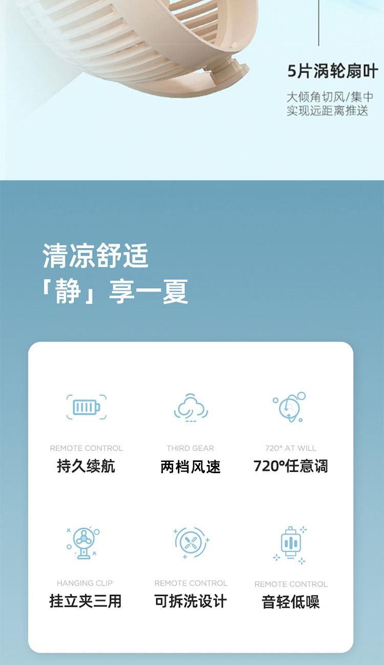 風(fēng)扇檔位:直插2檔 額定功率:5W 產(chǎn)品凈量:0.42kg 電源線長:直插約120cm(含機(jī)內(nèi)部 產(chǎn)品尺寸:130*95*185mm 1、掛立兩用解鎖夏日清涼 2、兩檔風(fēng)速/720°旋轉(zhuǎn) 3、5片渦輪扇葉直流集中送風(fēng)