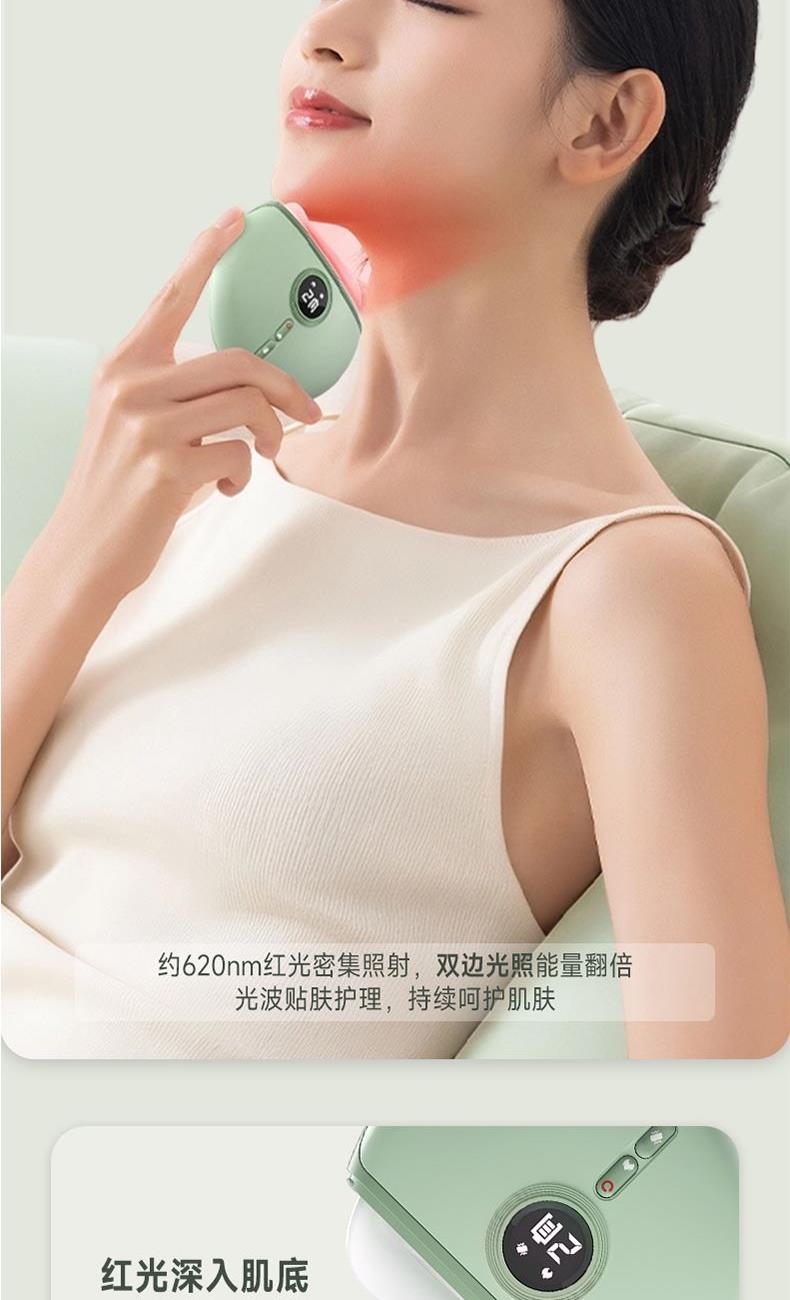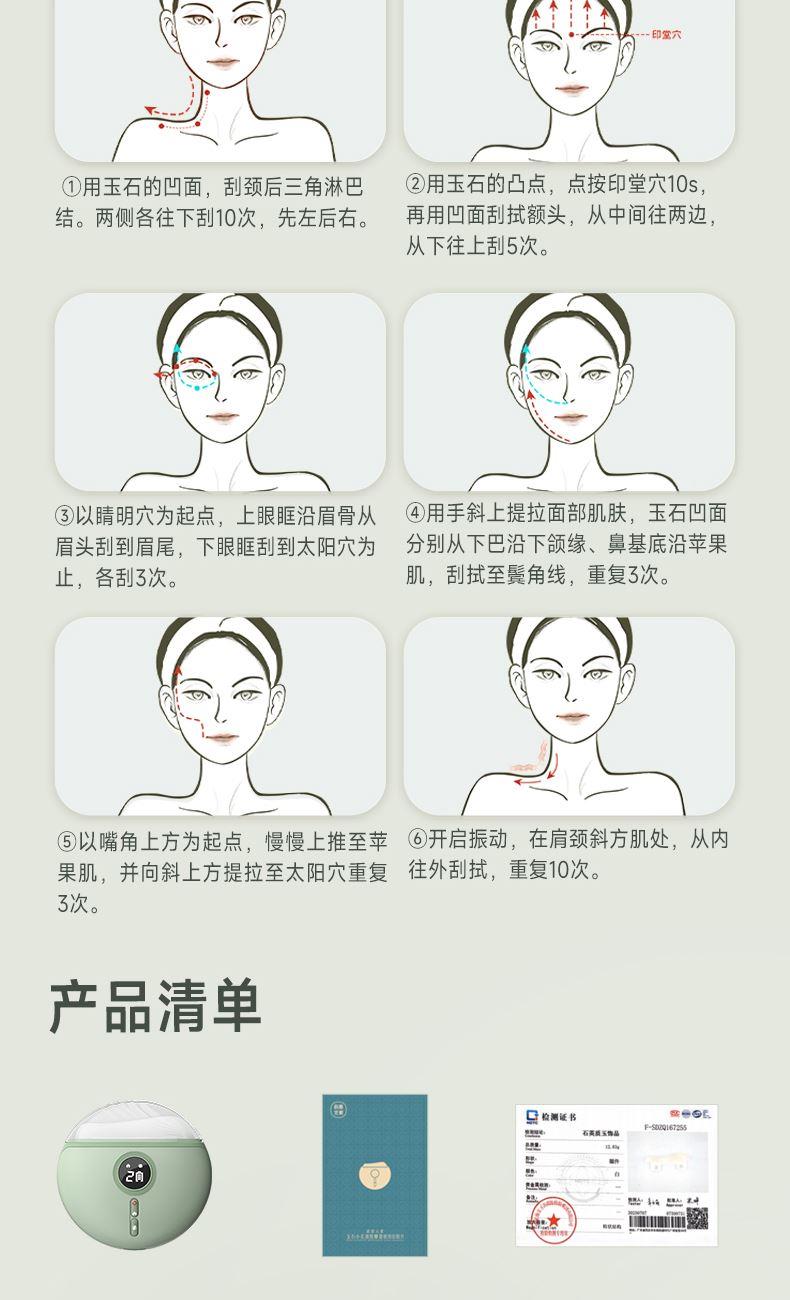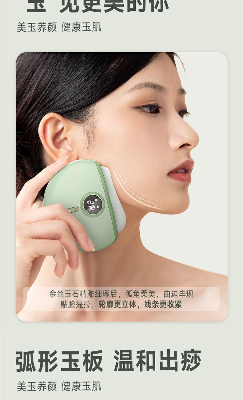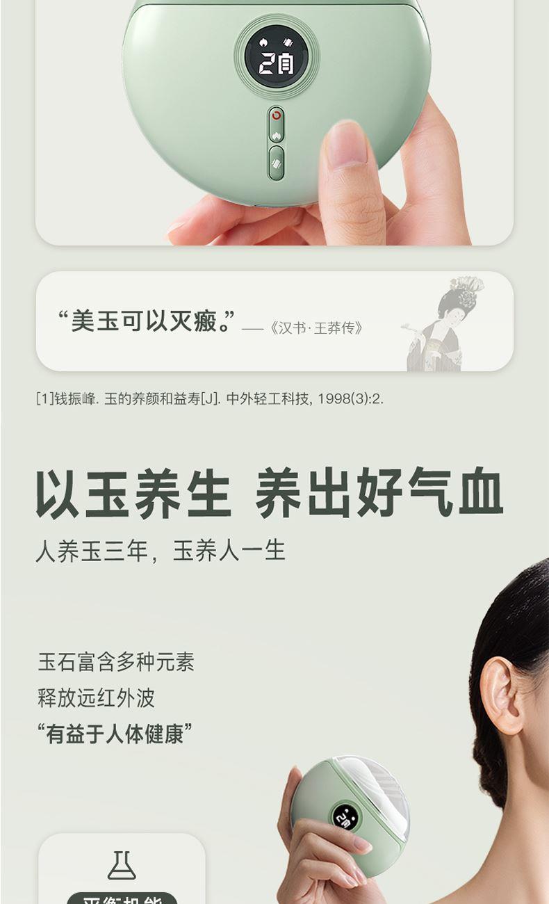 產(chǎn)品功能:金絲玉材質(zhì),富含多種有益等元素,8-15微米遠(yuǎn)紅外波;3檔熱敷+紅光+震動(dòng),調(diào)節(jié)經(jīng)絡(luò)氣血;山型設(shè)計(jì),玉石刮板,貼合眼部、臉部等部位;無(wú)線設(shè)計(jì),長(zhǎng)續(xù)航大電池,充一次用一周