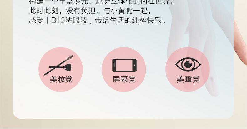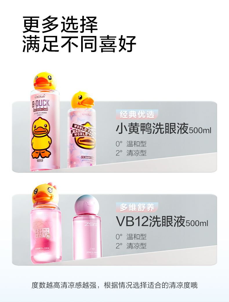 500ml 1.深層清潔眼部灰塵、眼妝殘留、蛋白沉淀等異物。 2.添加維生素B12、海藻糖、?;撬岬葼I養(yǎng)成分,水潤滋養(yǎng)眼部 3.pH值、滲透壓接近淚液,溫和洗眼,不刺激眼睛。 4.兩種清涼度可選,自由選擇合適的清涼度。 5.小黃鴨外包裝升級,解鴨加倍