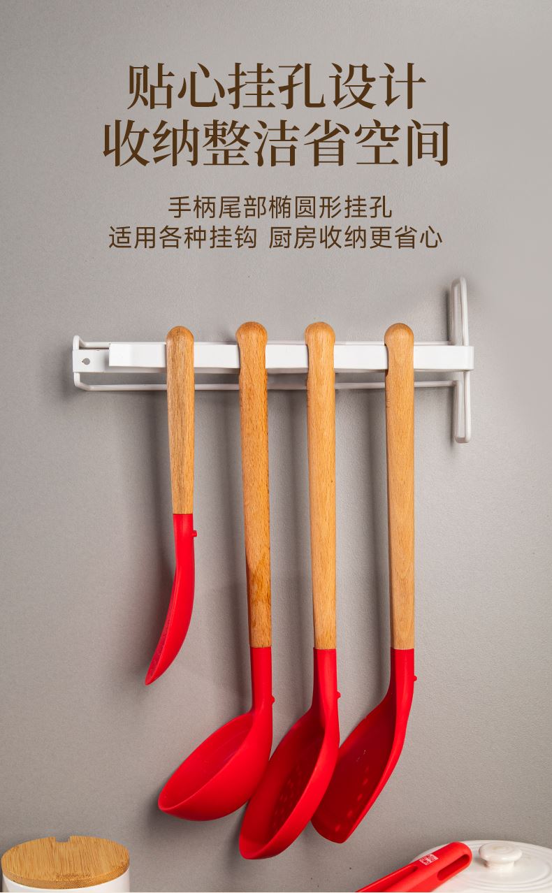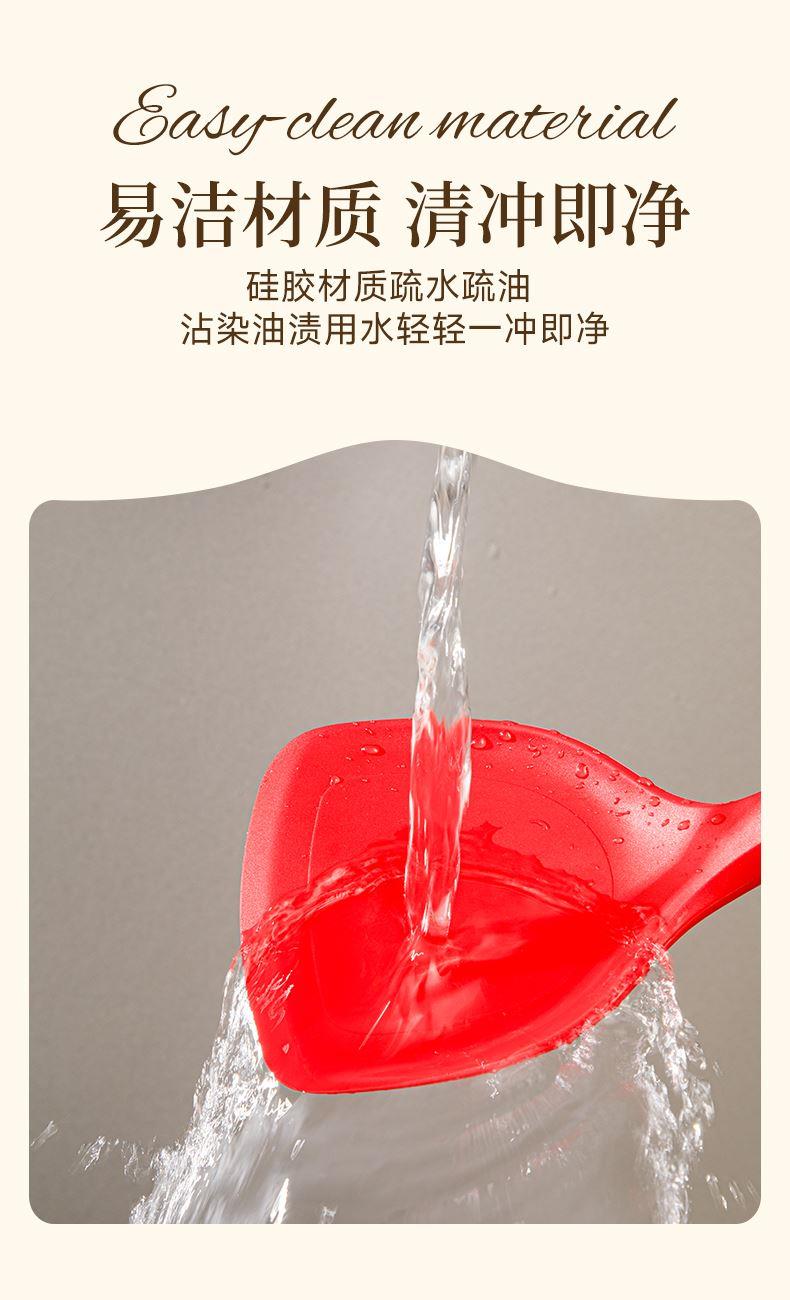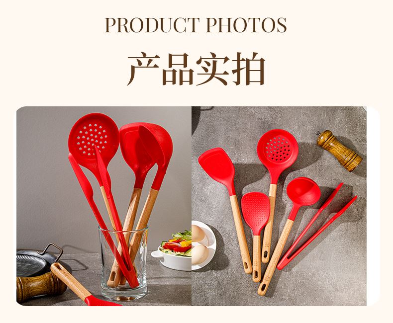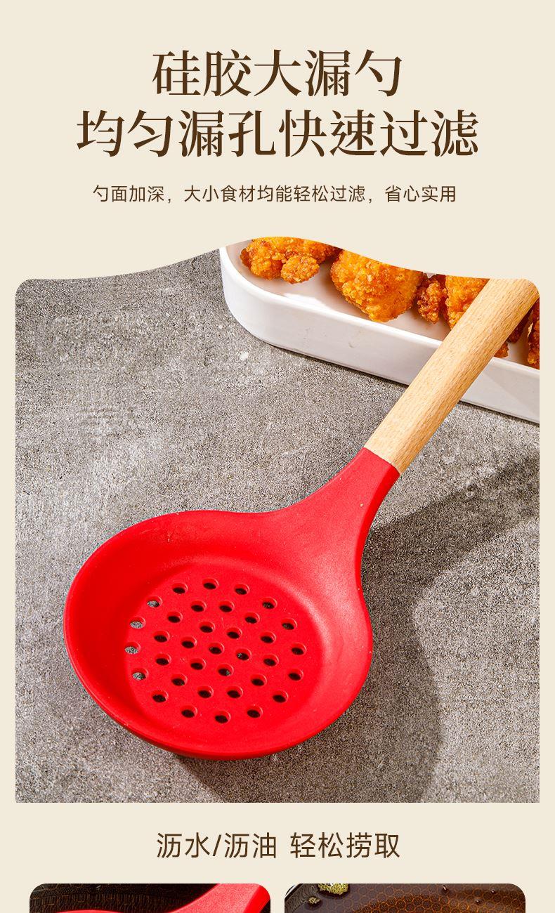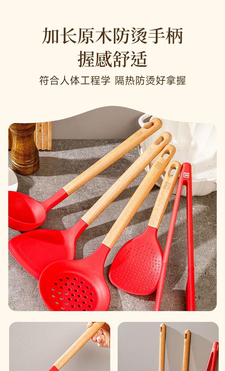 產(chǎn)品顏色:紅色 產(chǎn)品配置:中式鏟、湯勺、漏勺、飯勺、食物夾 產(chǎn)品貨號:2219060104 外箱尺寸:790*42*410mm 1、耐230℃高溫不變形,不含熒光劑 2、加長原木防燙手柄,久握不累手 3、不粘鍋專用,不卷邊不傷鍋 4、硅膠材質(zhì)疏油疏水