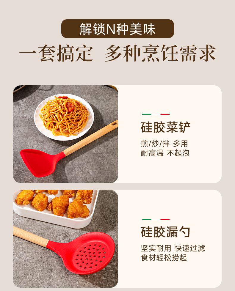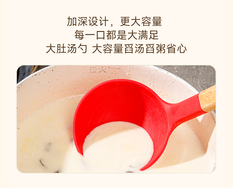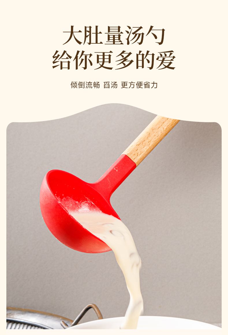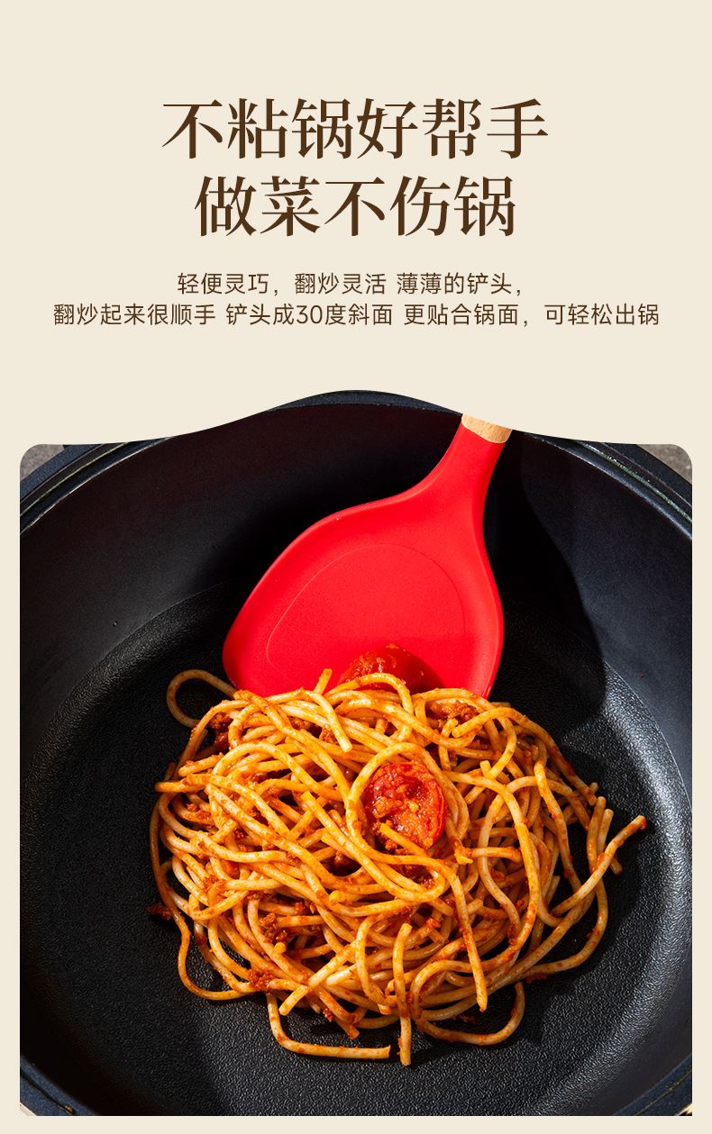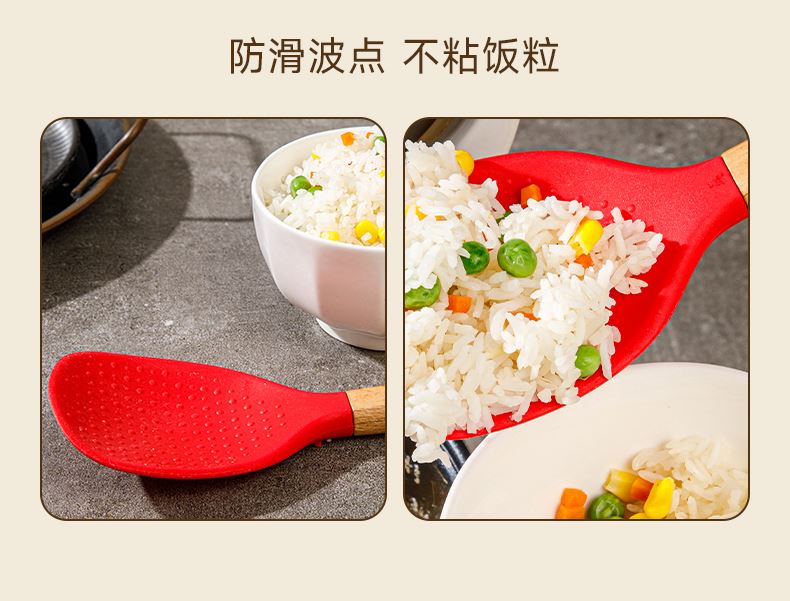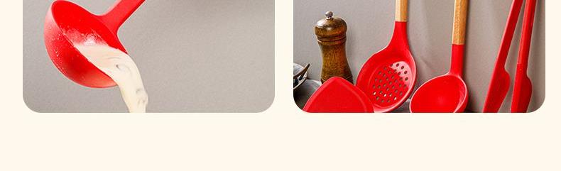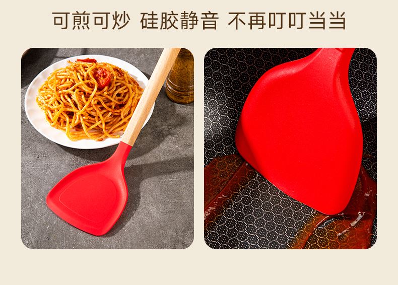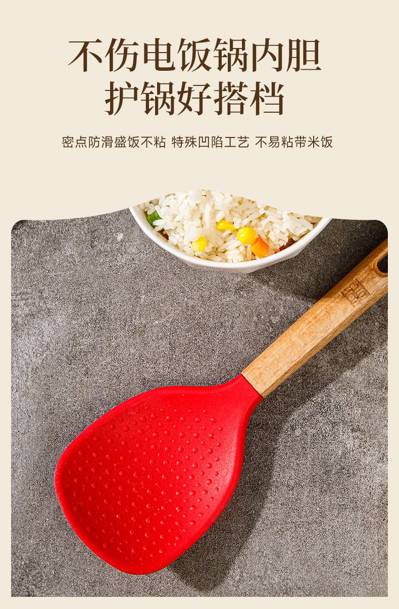產(chǎn)品顏色:紅色 產(chǎn)品配置:中式鏟、湯勺、漏勺、飯勺、食物夾 產(chǎn)品貨號:2219060104 外箱尺寸:790*42*410mm 1、耐230℃高溫不變形,不含熒光劑 2、加長原木防燙手柄,久握不累手 3、不粘鍋專用,不卷邊不傷鍋 4、硅膠材質(zhì)疏油疏水