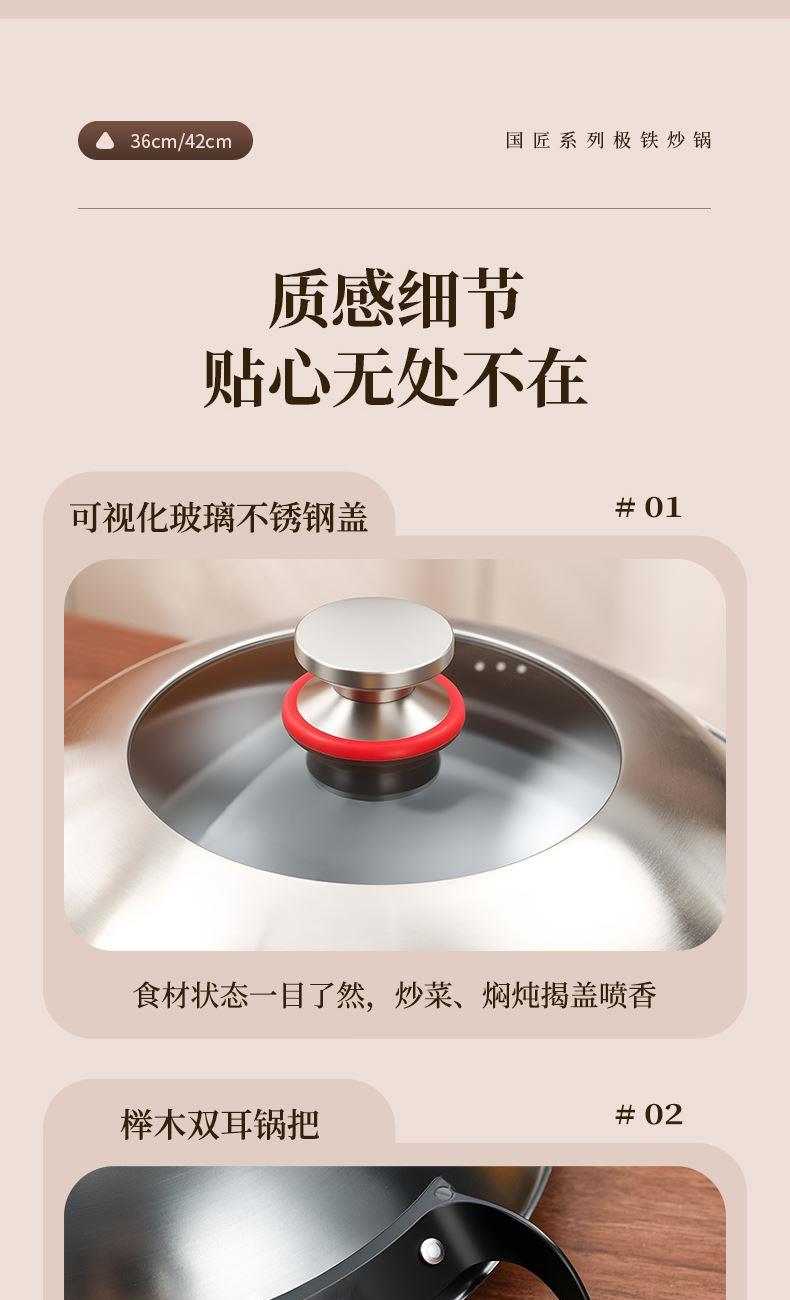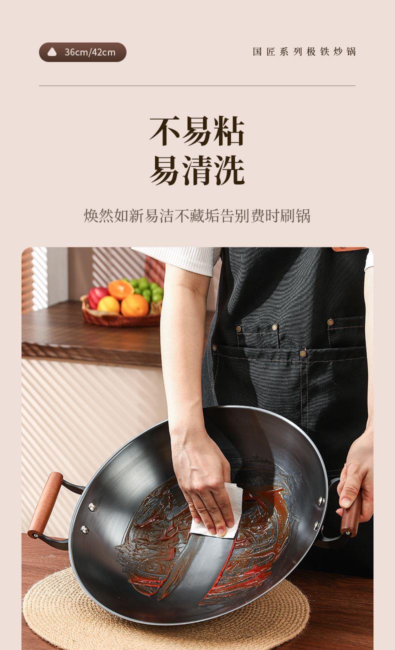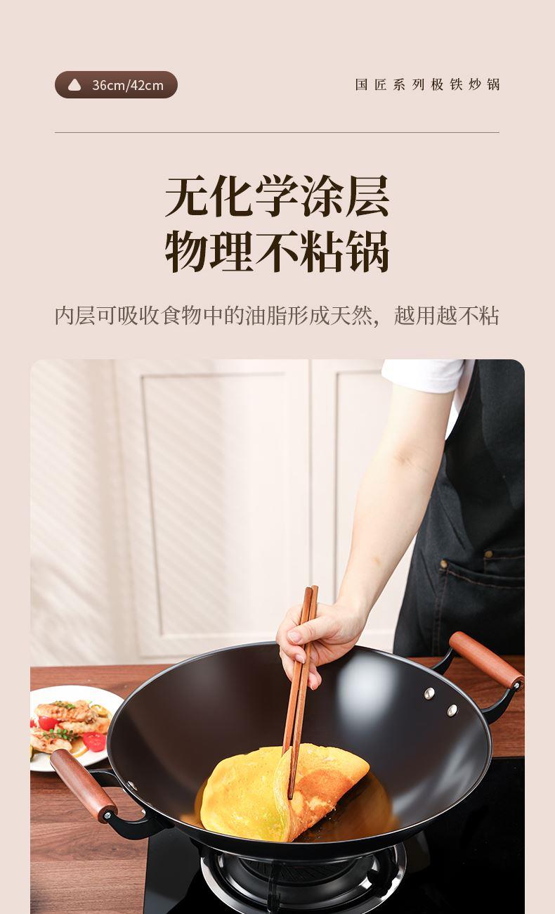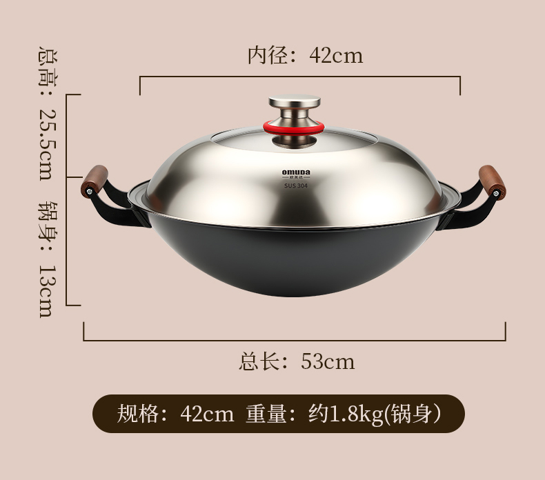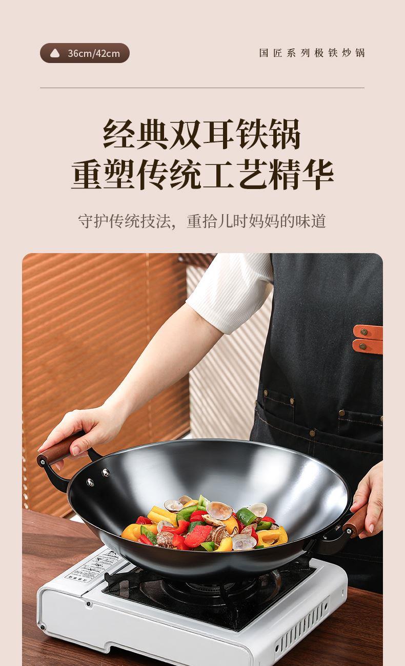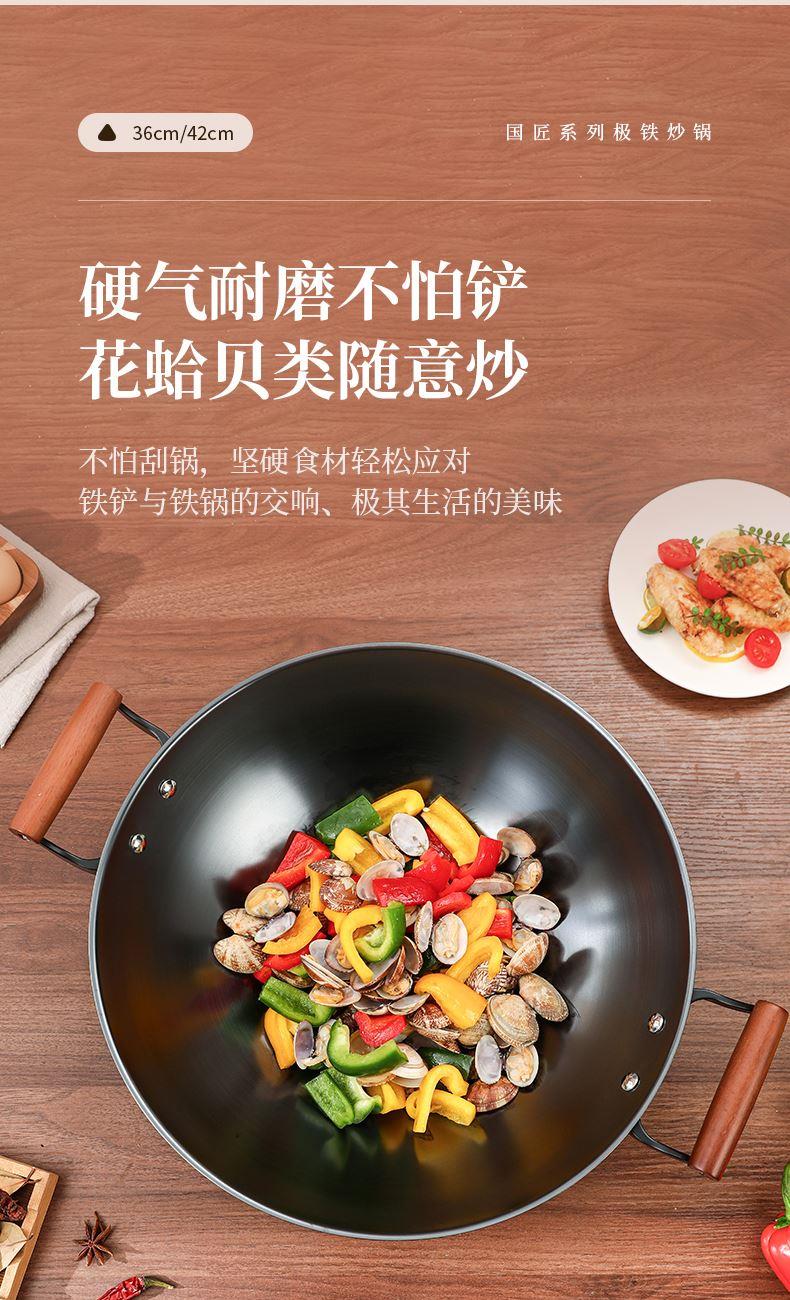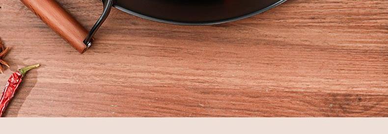 直徑:42cm 凈重:1.8kg 材質:精鐵 ①采用高純度精鐵,純度高達 99% 以上,品質好。 ②運用深層氮化工藝,具備耐磨耐腐蝕特性,長久使用不易生銹。 ③無涂層物理性持久不粘,健康安全有保障。 ④采用強力冷壓技術,底厚壁薄,導熱迅速。 ⑤雙側耳實木手柄,握持省力,隔熱防燙。 ⑥擁有聚能螺紋外底,防滑且實用。