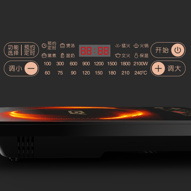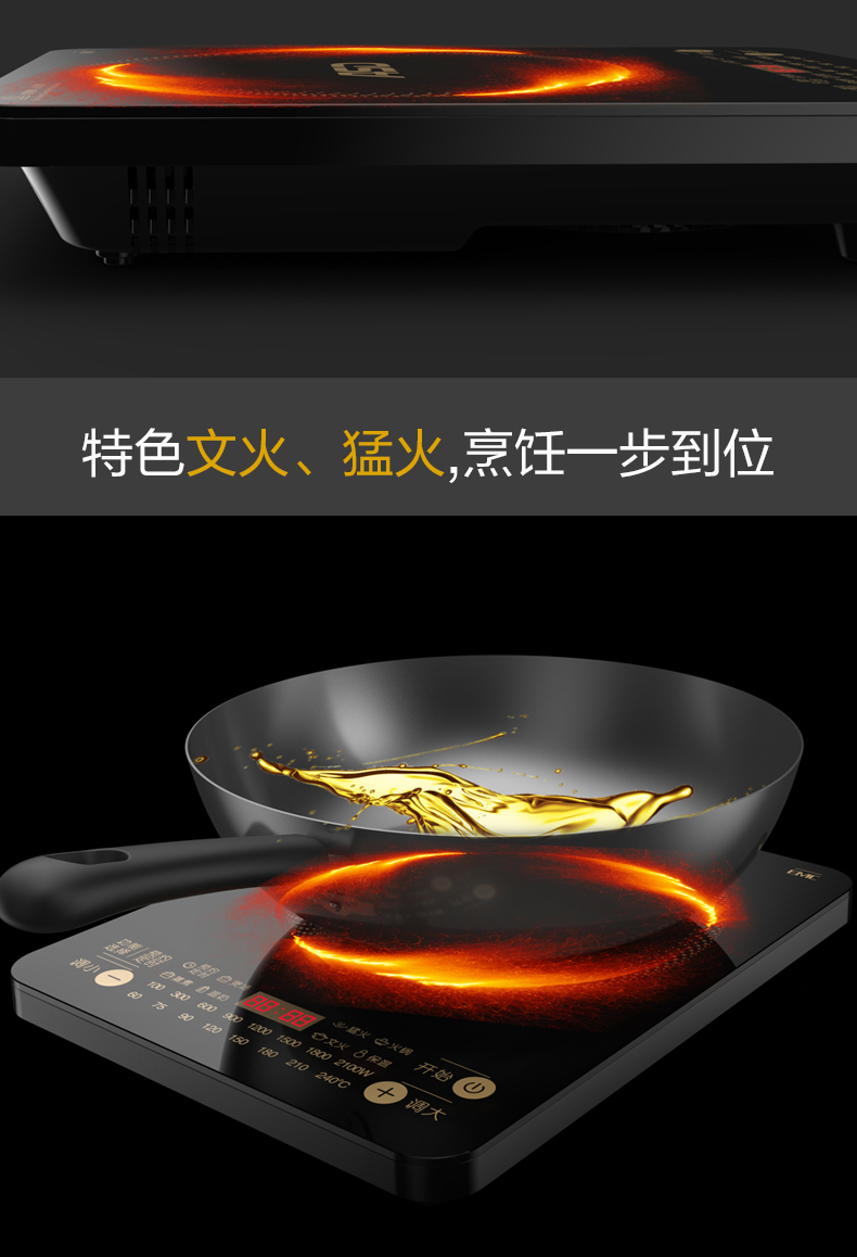 產(chǎn)品型號:AI-F21C217 產(chǎn)品功率:2100W 額定電壓:220V 額定頻率:50Hz 彩盒尺寸:341*101*416 產(chǎn)品凈重:2.65kg 1、歐克微晶面板,防刮耐磨易清潔。 2、三級能耗,高效節(jié)能,空間利用大。 3、四位數(shù)碼顯示,特設(shè)文火,猛火。 4、特色文火、猛火,烹飪一步到位 5、多段火力,自由選擇。