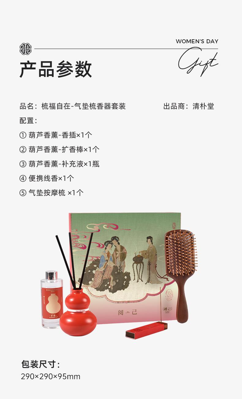 ① 有福氣-葫蘆香薰瓶×1只 ② 有福氣-香薰液×1瓶 ③ 香薰擴(kuò)香棒×1組 ④ 有福氣-隨身線香×1盒 ⑤ 梳福-氣墊按摩梳×1把 ⑥ 中式包裝手袋×1套 一把“自帶福氣”的療愈梳 讓淡淡清幽隨發(fā)絲撥動(dòng) 在梳掉壓力與疲憊間 予你福祿隨身的悅己儀式