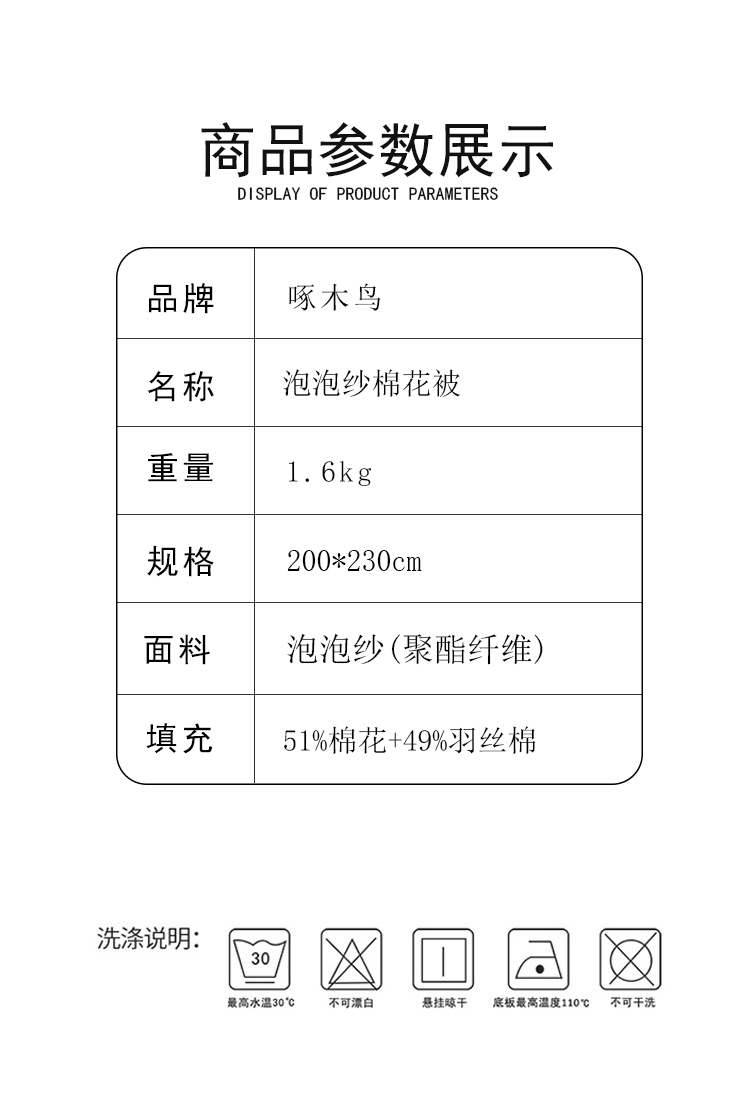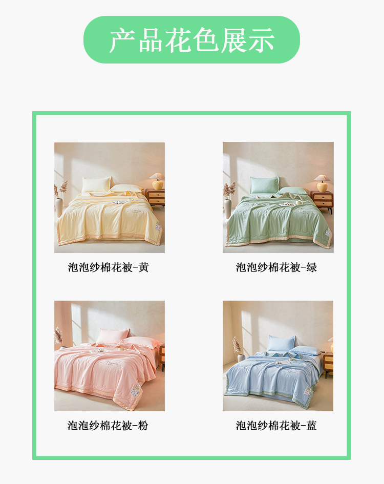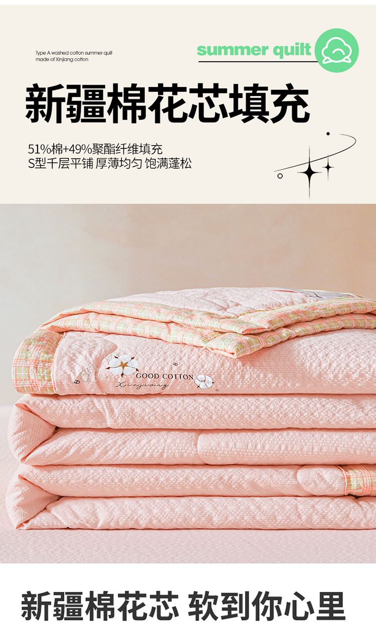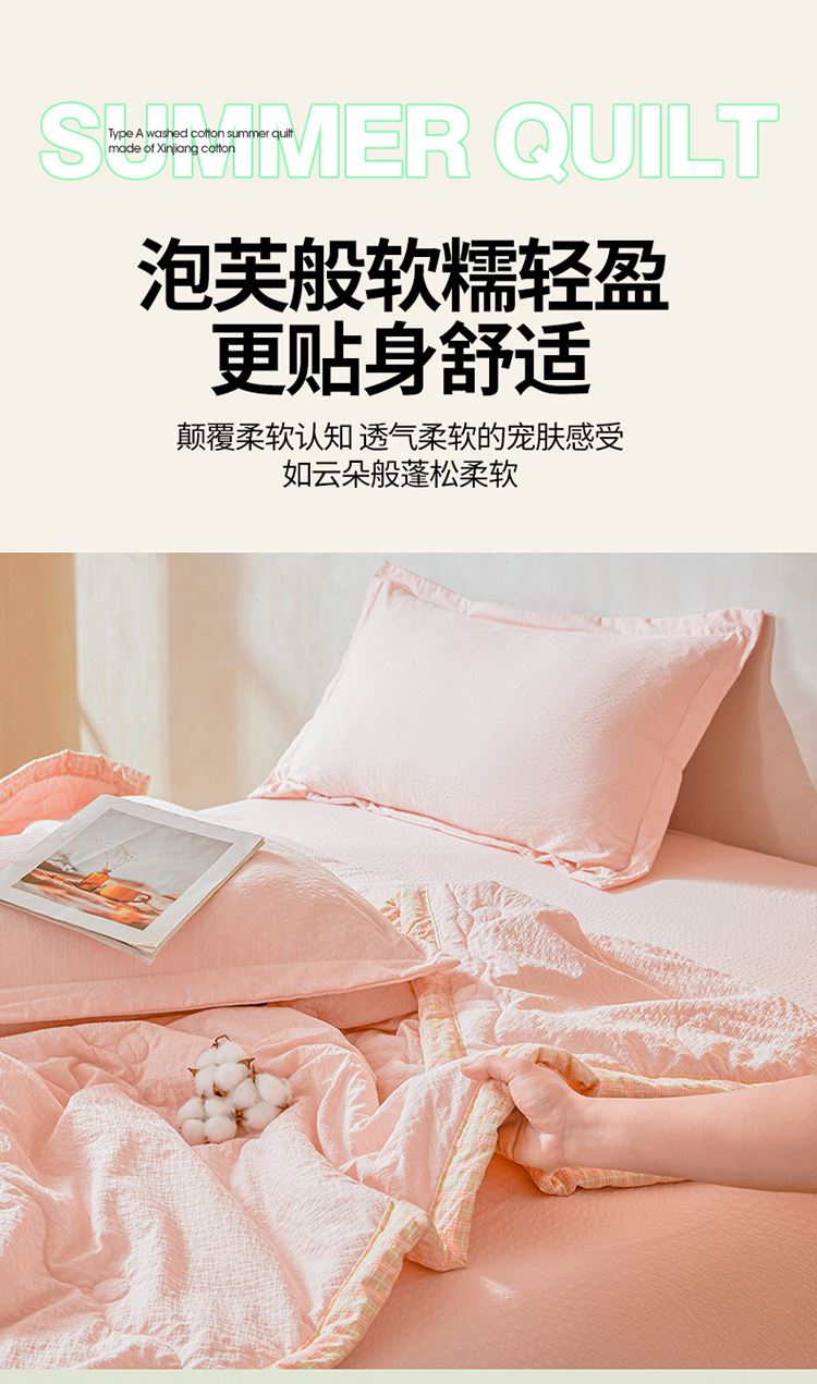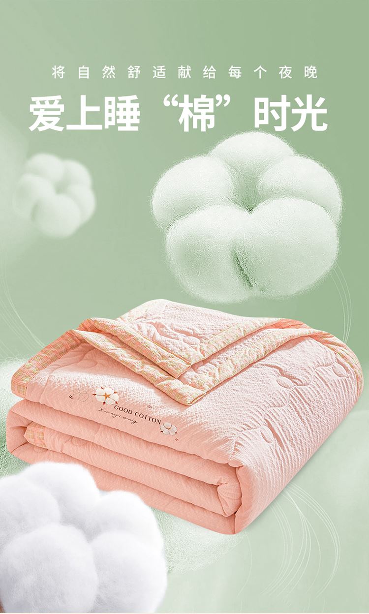 規(guī)格:200*230cm 面料:泡泡紗(聚酯纖維) 填充:51%棉花+49%羽絲棉 重量:1.5kg 賣點(diǎn): 1、棉花填充,睡得安心,輕薄不壓身,裸睡也舒服 2、水洗綿面料,軟糯親膚不扎身,透氣不悶汗,夏天蓋著超清爽。 3、簡(jiǎn)約耐看,夏天臥室必備