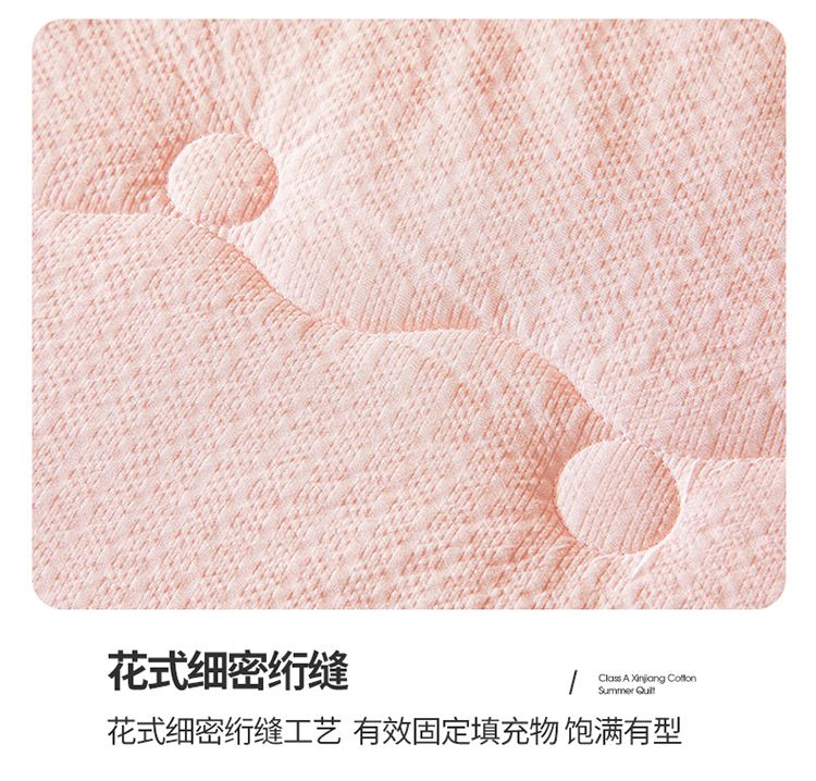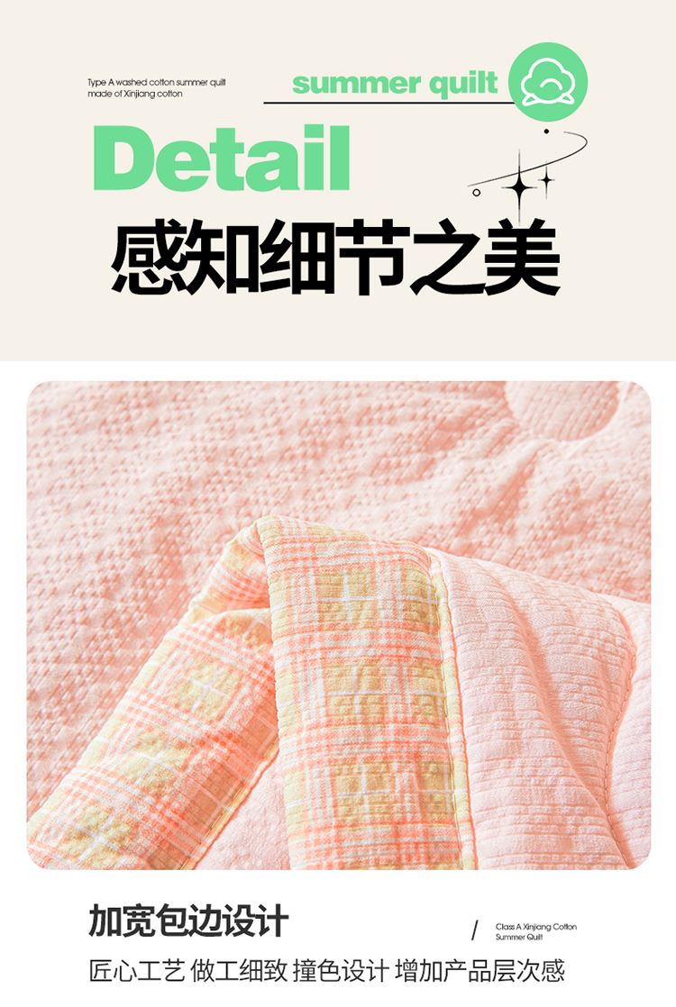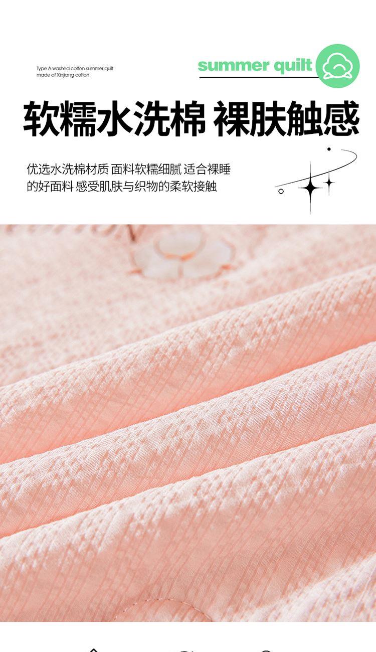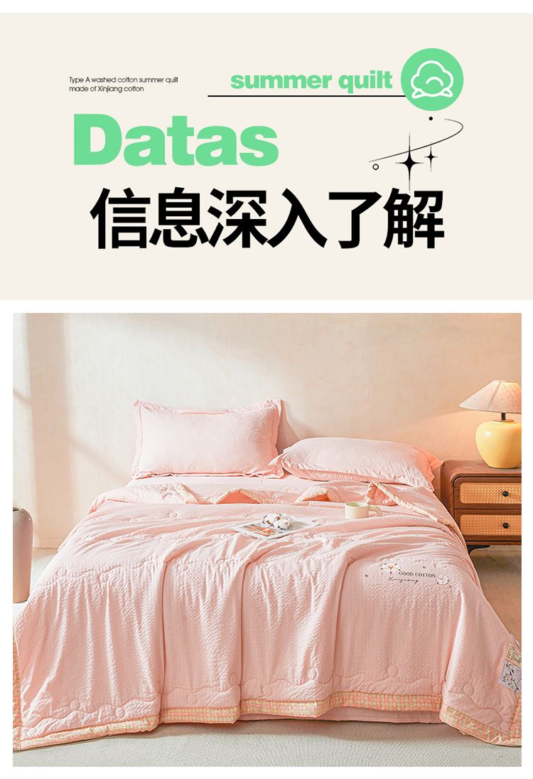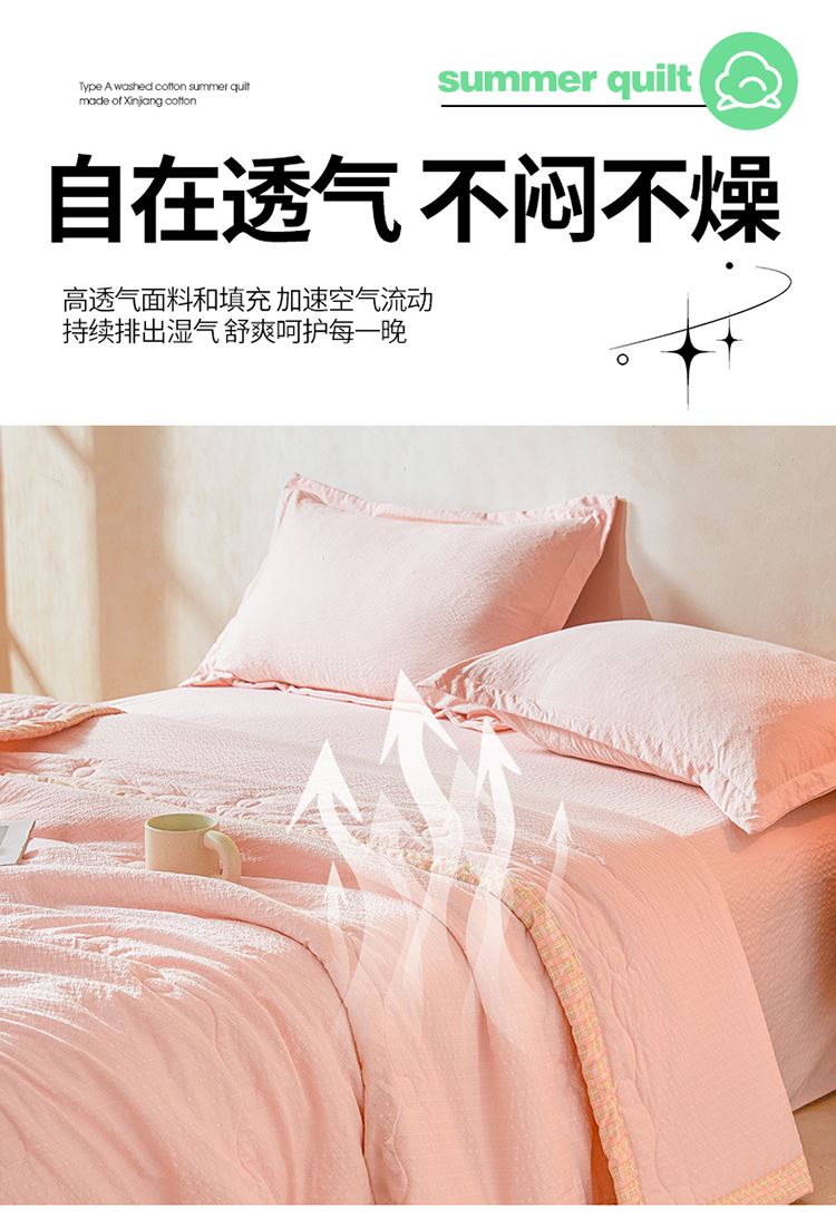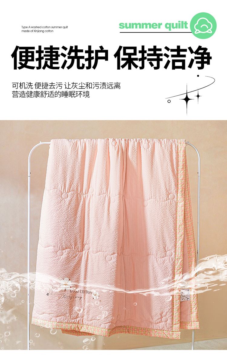 規(guī)格:200*230cm 面料:泡泡紗(聚酯纖維) 填充:51%棉花+49%羽絲棉 重量:1.5kg 賣點(diǎn): 1、棉花填充,睡得安心,輕薄不壓身,裸睡也舒服 2、水洗綿面料,軟糯親膚不扎身,透氣不悶汗,夏天蓋著超清爽。 3、簡(jiǎn)約耐看,夏天臥室必備