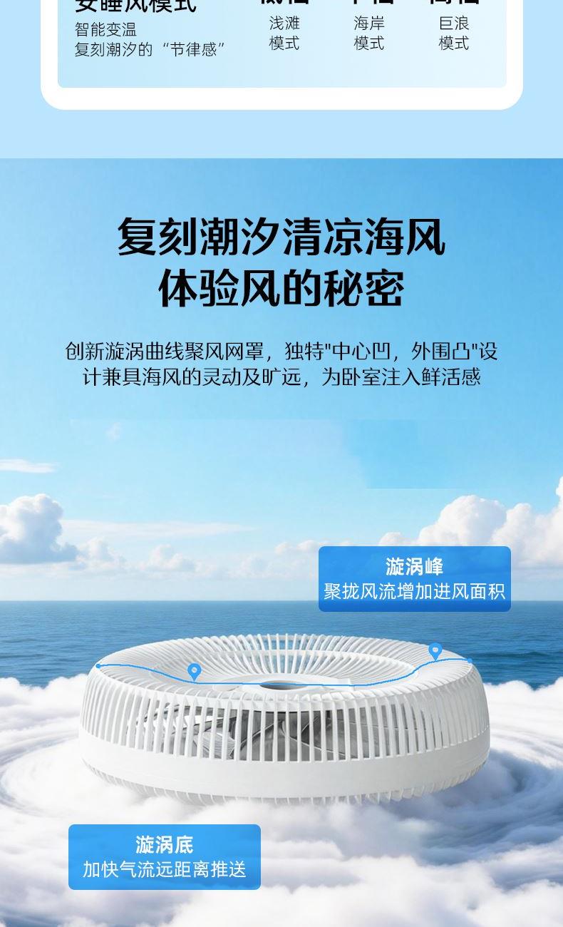 創(chuàng)新漩渦曲線聚風(fēng)網(wǎng)罩,獨特"中心凹,外圍凸"設(shè)計兼具海風(fēng)的靈動及曠遠,為臥室注入鮮活感。