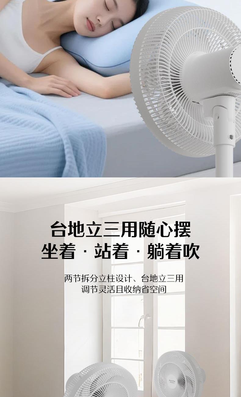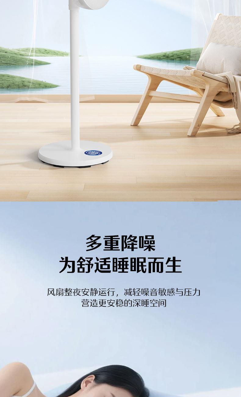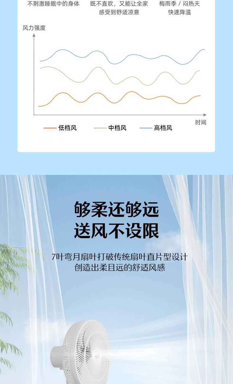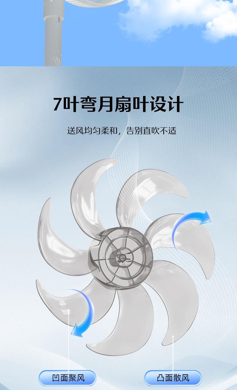 六系澎湃電機+雙環(huán)漩渦曲線網(wǎng)罩+7葉彎月扇葉送風(fēng)均勻柔和、告別直吹不適。