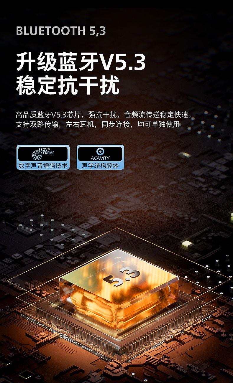 6、藍(lán)牙5.3芯片 ,取出耳機(jī)秒連,連接快、準(zhǔn)、穩(wěn), 功耗低 不卡頓;
