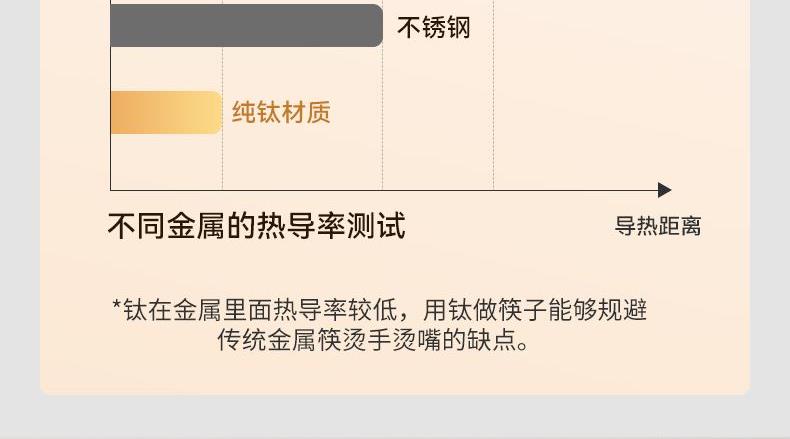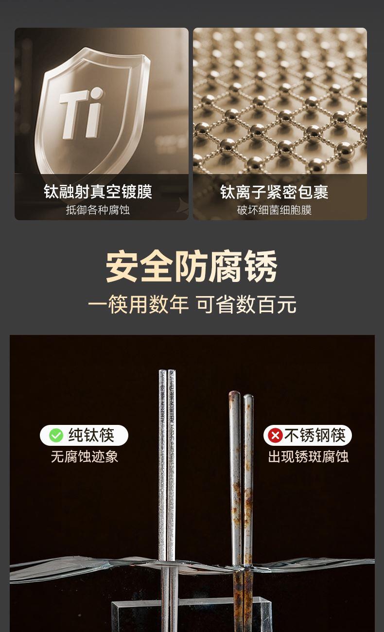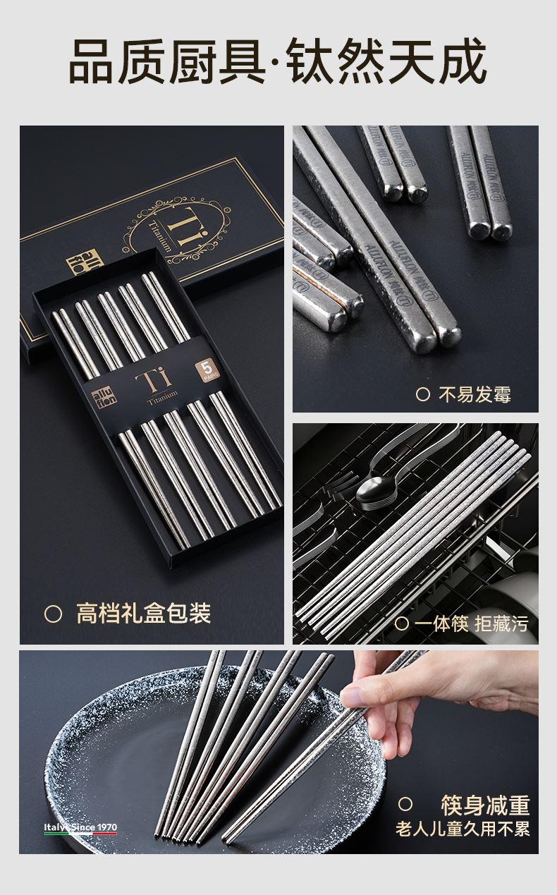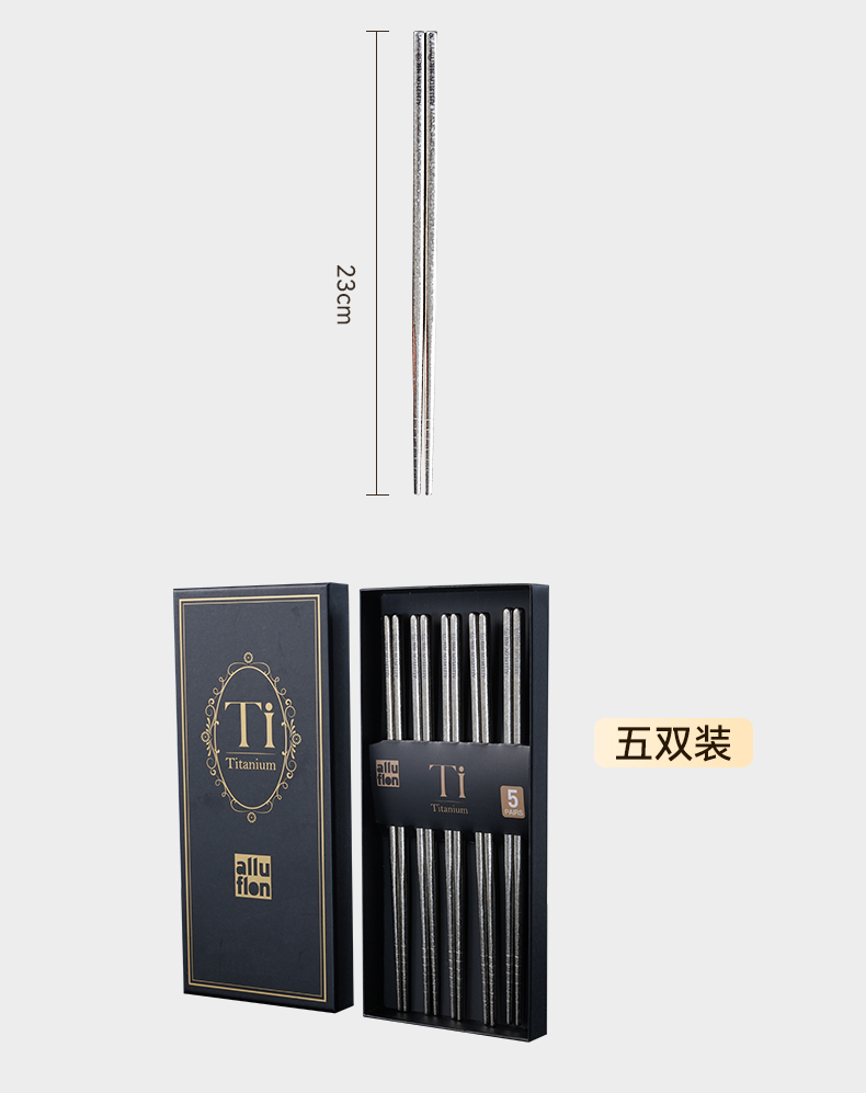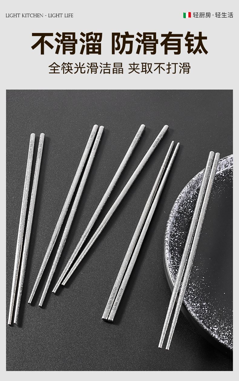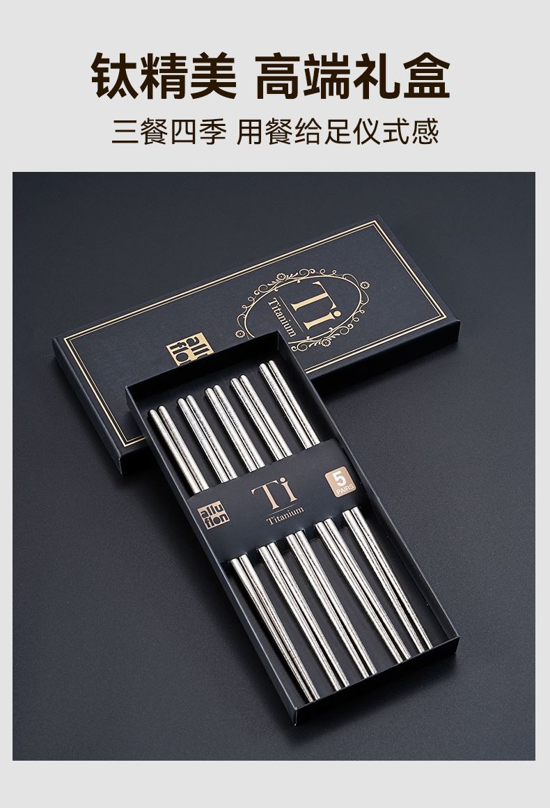 規(guī)格:5雙裝 材質(zhì):純鈦 入箱:10套*8盒 包裝尺寸:247*111*18(中盒) 1、純鈦板材 2、中空防燙,超輕量設(shè)計(jì) 3、一體筷,耐高溫,耐酸堿 4、抗腐蝕,防霉易潔