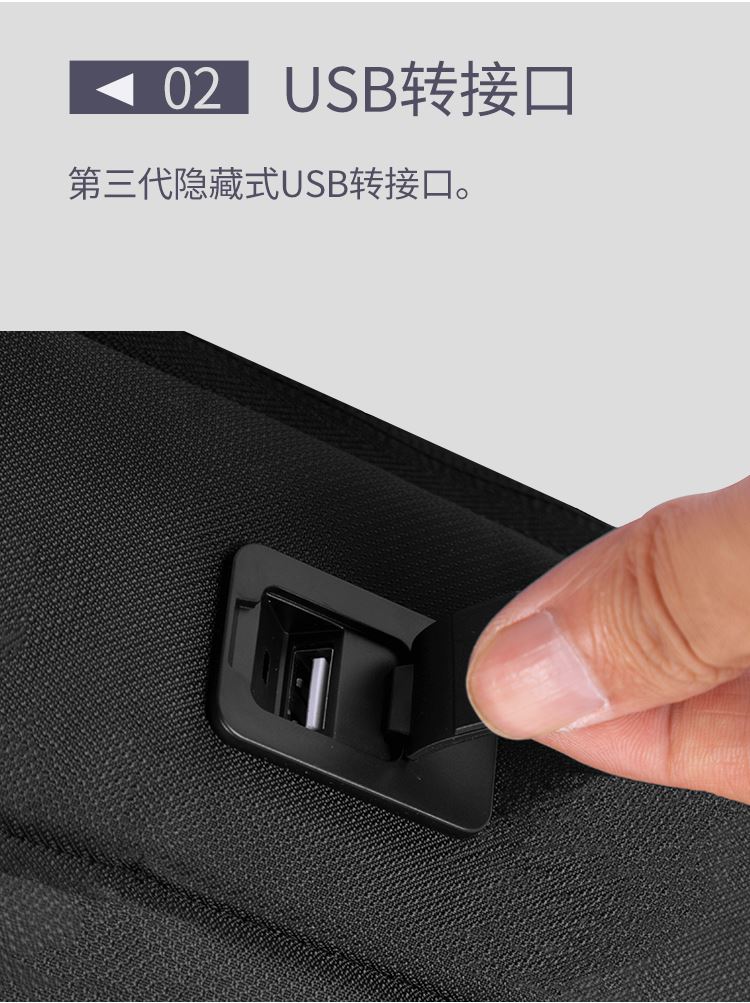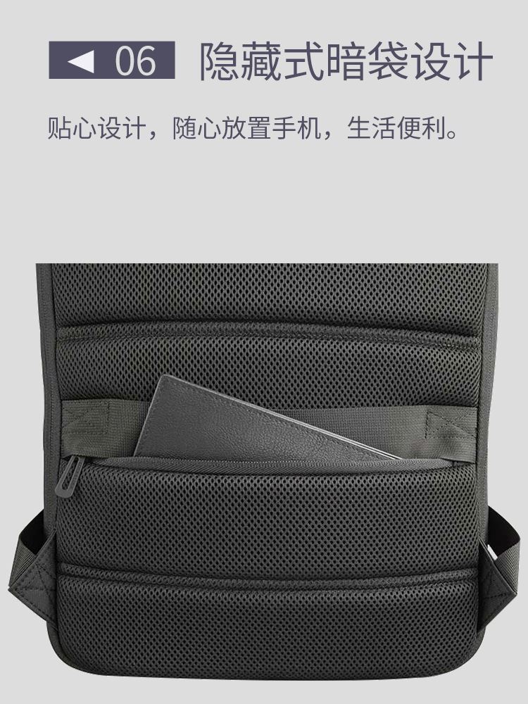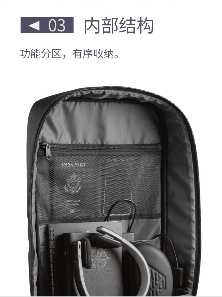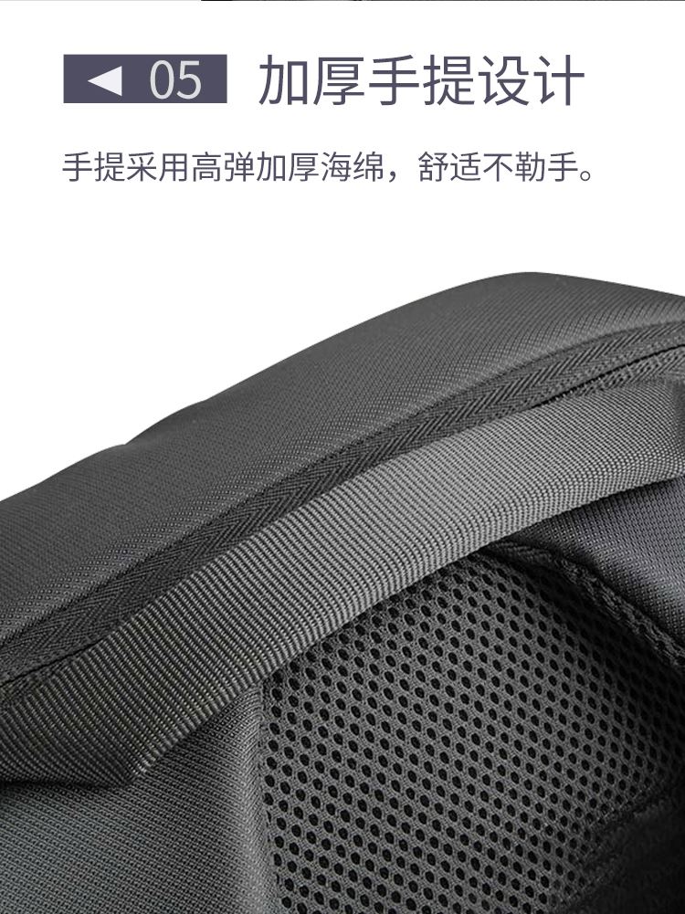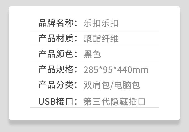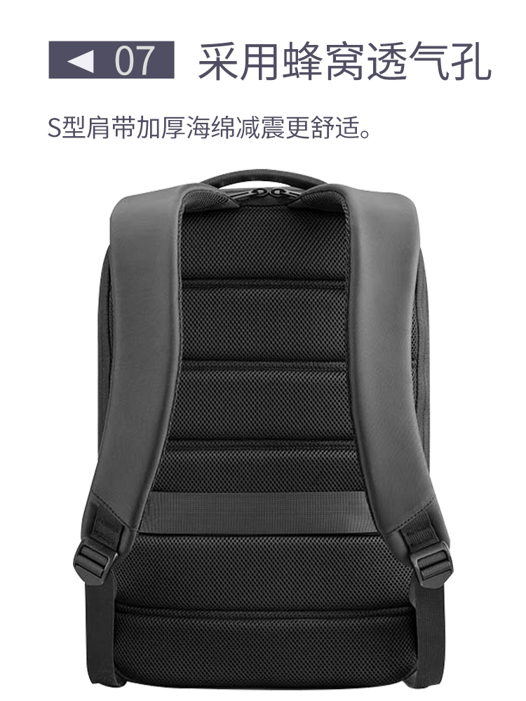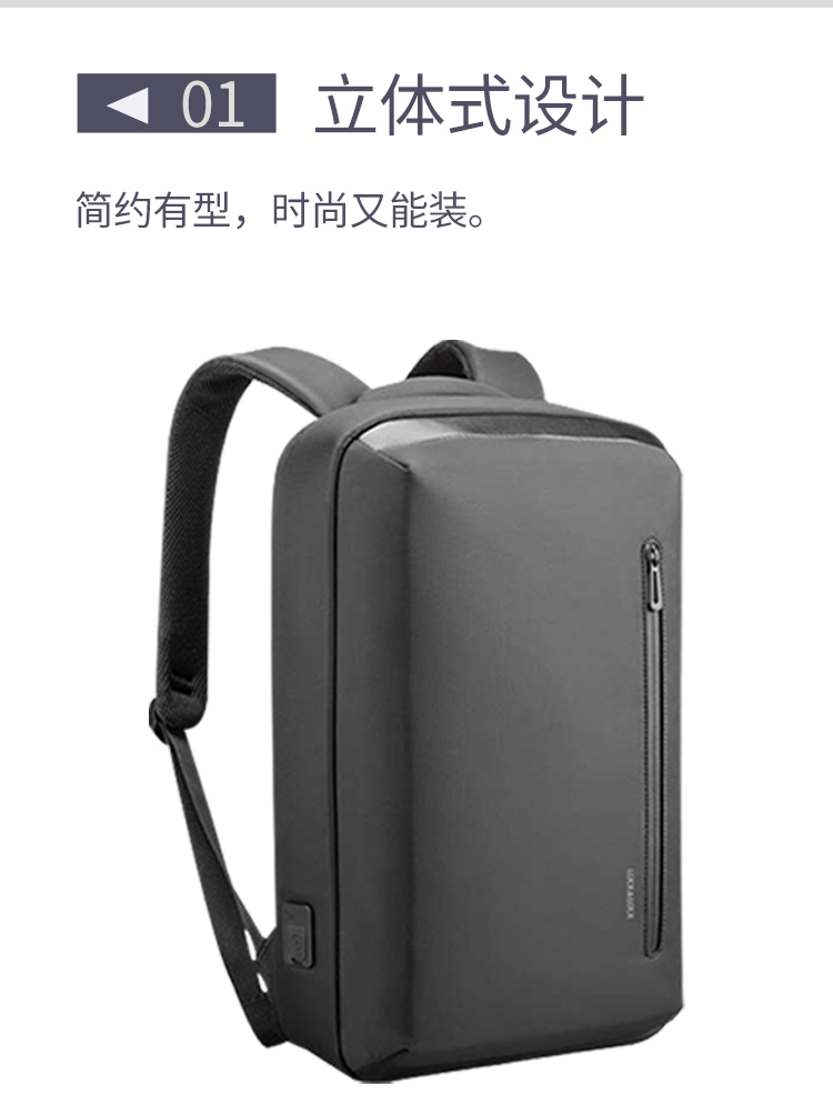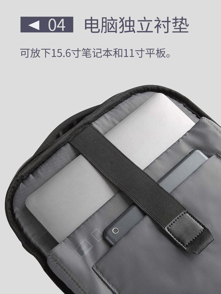 材質(zhì):聚酯纖維 產(chǎn)品顏色:黑色 產(chǎn)品規(guī)格:285mm*95mm*440mm 立方體設(shè)計,簡約有型,時尚又能裝 采用第三代隱藏式USB轉(zhuǎn)接口 內(nèi)部功能分區(qū),有序收納 電腦獨立襯底,可放下15.6寸筆記本 加厚手提設(shè)計,舒適不勒手 隱藏式暗袋設(shè)計,生活便利 采用蜂窩透氣孔,S型肩帶加厚海綿減震更舒適