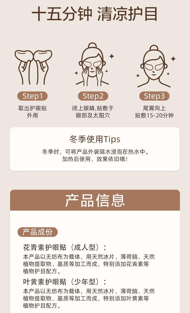 規(guī)格: 15對/盒 內(nèi)袋2貼/袋(尾翼型) 外盒:2貼/袋*15(尾翼型) 商品毛重:169.00g 本產(chǎn)品以無紡布為載體,用天然冰片、薄荷腦、天然植物提取物、基質(zhì)等加工而成,特別添加花青素等植物護目配方。