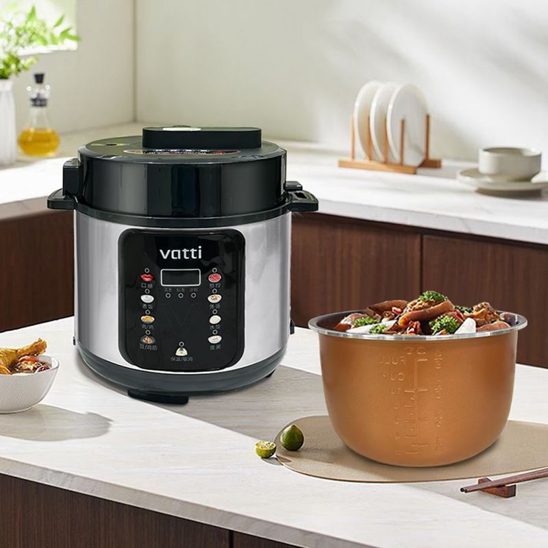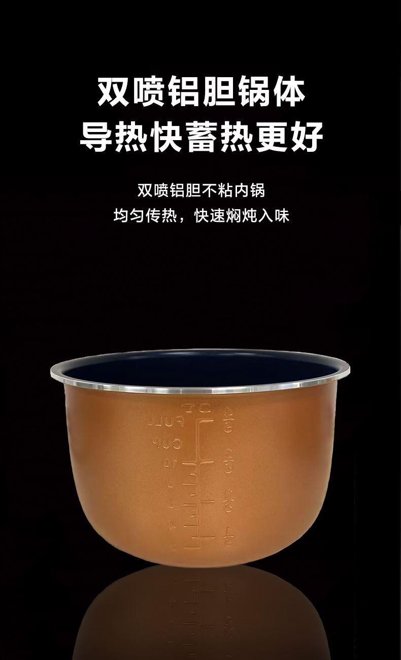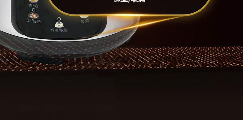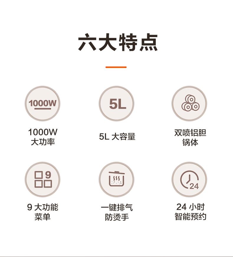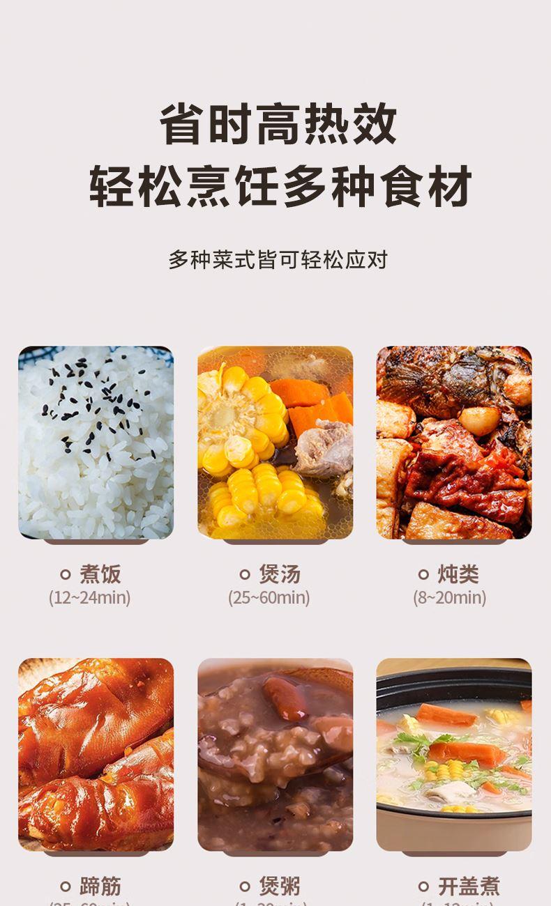 1.高壓烹制:高壓高溫,速熱入味,充分保留食材本味營(yíng)養(yǎng),湯濃飯香。 2.黃金容量:5L黃金大容量,多種烹飪功能,解鎖花樣美味。 3.智能觸控: 智能觸控操作,一鍵烹飪,輕松操作。 4.智能預(yù)約:24H長(zhǎng)效預(yù)約,提前預(yù)約,準(zhǔn)點(diǎn)開(kāi)飯。 5.雙噴鋁膽:導(dǎo)熱快一倍,防刮耐用,燉煮不粘不糊鍋。