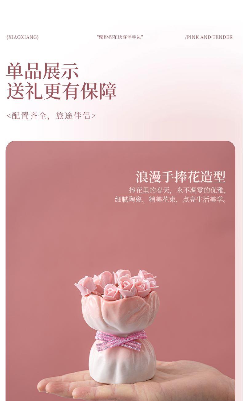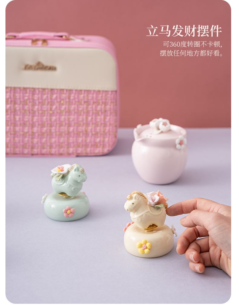壺:9.8*8.5厘米140ml 品茗杯:5*4厘米35ml 陶瓷旋轉(zhuǎn)小馬擺件:7.7*6.3厘米 化妝箱:25*18*11厘米 手工捏花,造型美麗,精選高嶺土等優(yōu)質(zhì)原料,經(jīng)高溫?zé)贫?,質(zhì)地致密,氣孔率小,吸水率低,不易吸附異味,清洗便捷。送禮自用,兩相宜。