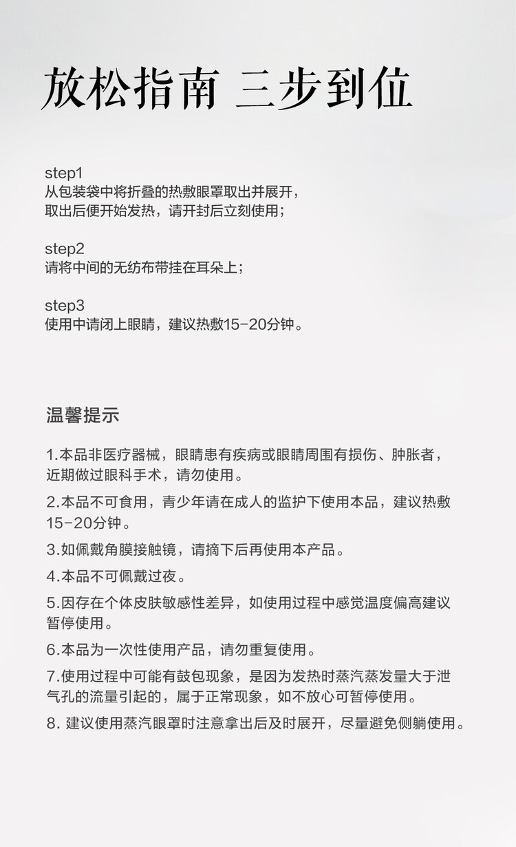 規(guī)格:1片/袋 10袋/盒 香型:沉香 保質(zhì)質(zhì):3年 1.添加百合、葉黃素、枸杞、等多重潤養(yǎng)成分,以草木精華溫養(yǎng)眼部。 2.綿密蒸汽熱敷,愉悅疲勞雙眼。 3.圈內(nèi)位置不發(fā)熱,呵護(hù)雙眼。 4.弱彈力耳掛,彈力適中,適合大小臉型;曲線貼合工藝,營造寧靜場域。 5.吸嗅沉浸,枕著江南眠,感受東方香