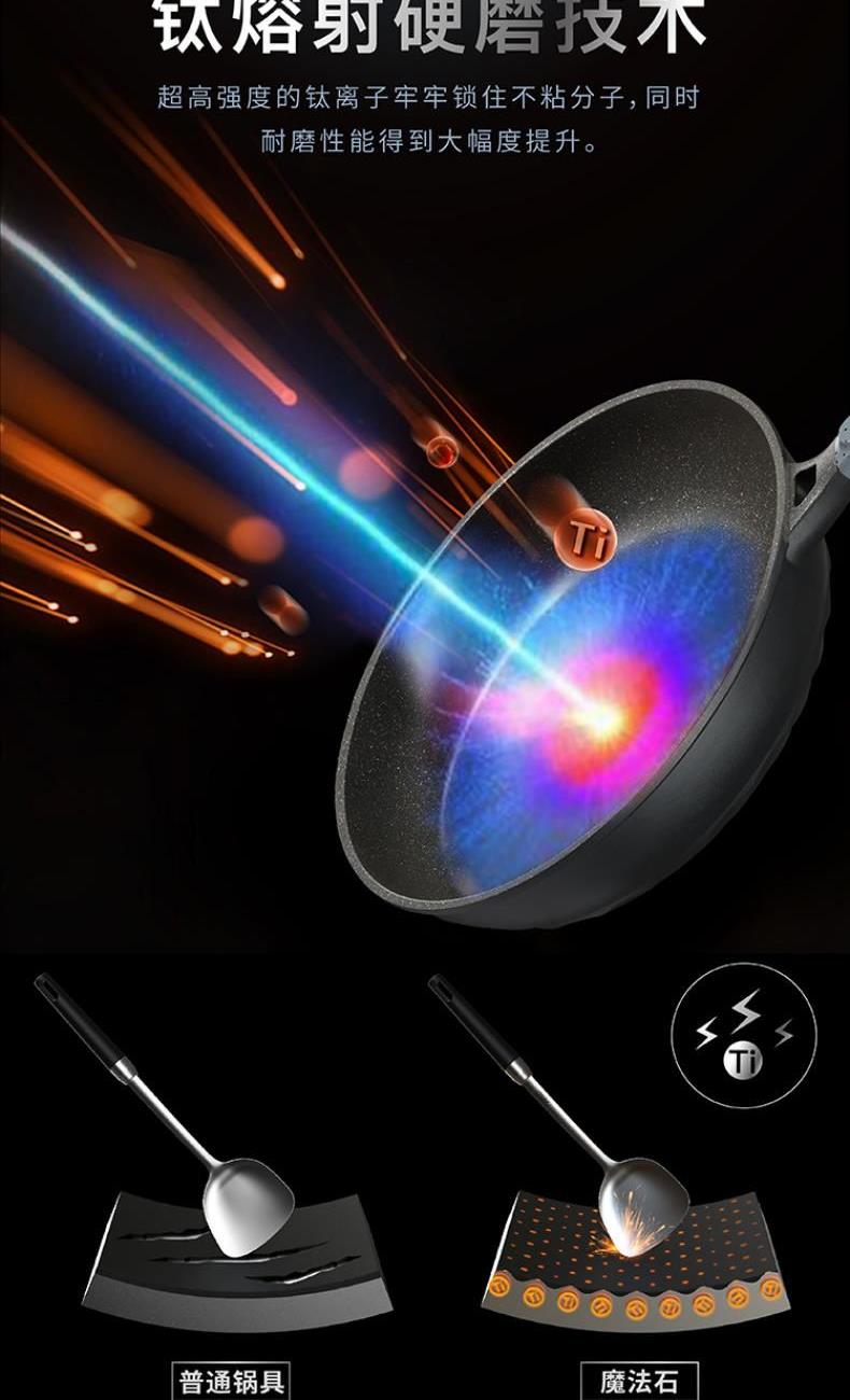 2、鈦熔射硬磨技術(shù)超高強(qiáng)度的鈦離子牢牢鎖住不粘分子,同時(shí)耐磨性能得到大幅度提升。