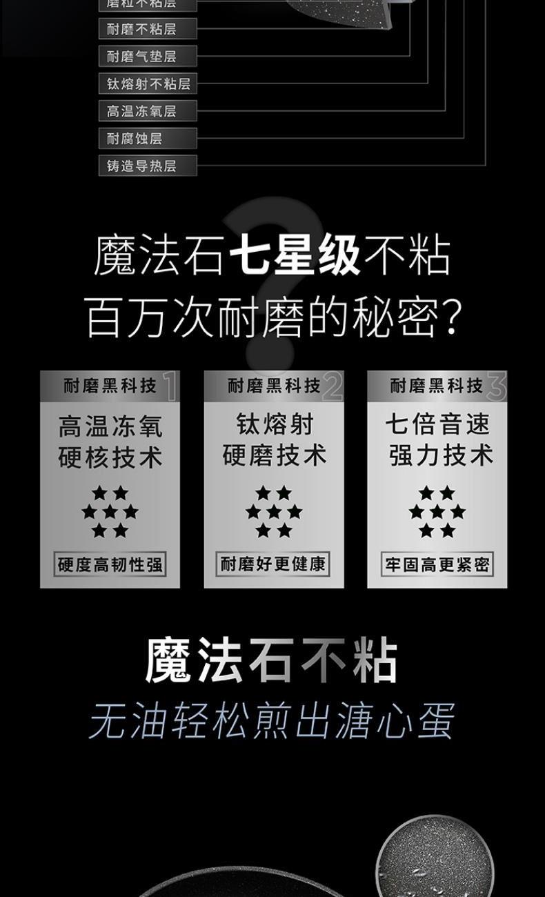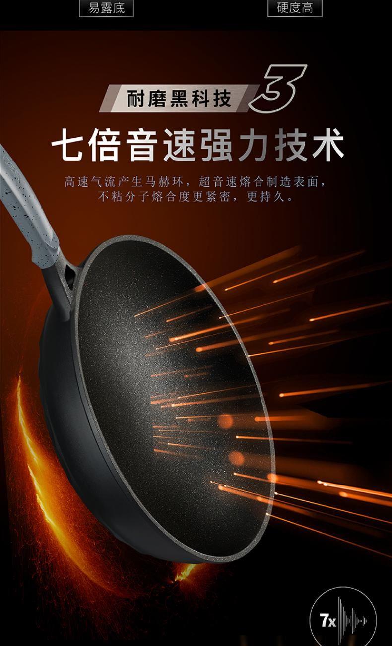 3、七倍音速?gòu)?qiáng)力技術(shù)高速氣流產(chǎn)生馬赫環(huán),超音速熔合制造表面,不粘分子熔合度更緊密,更持久。