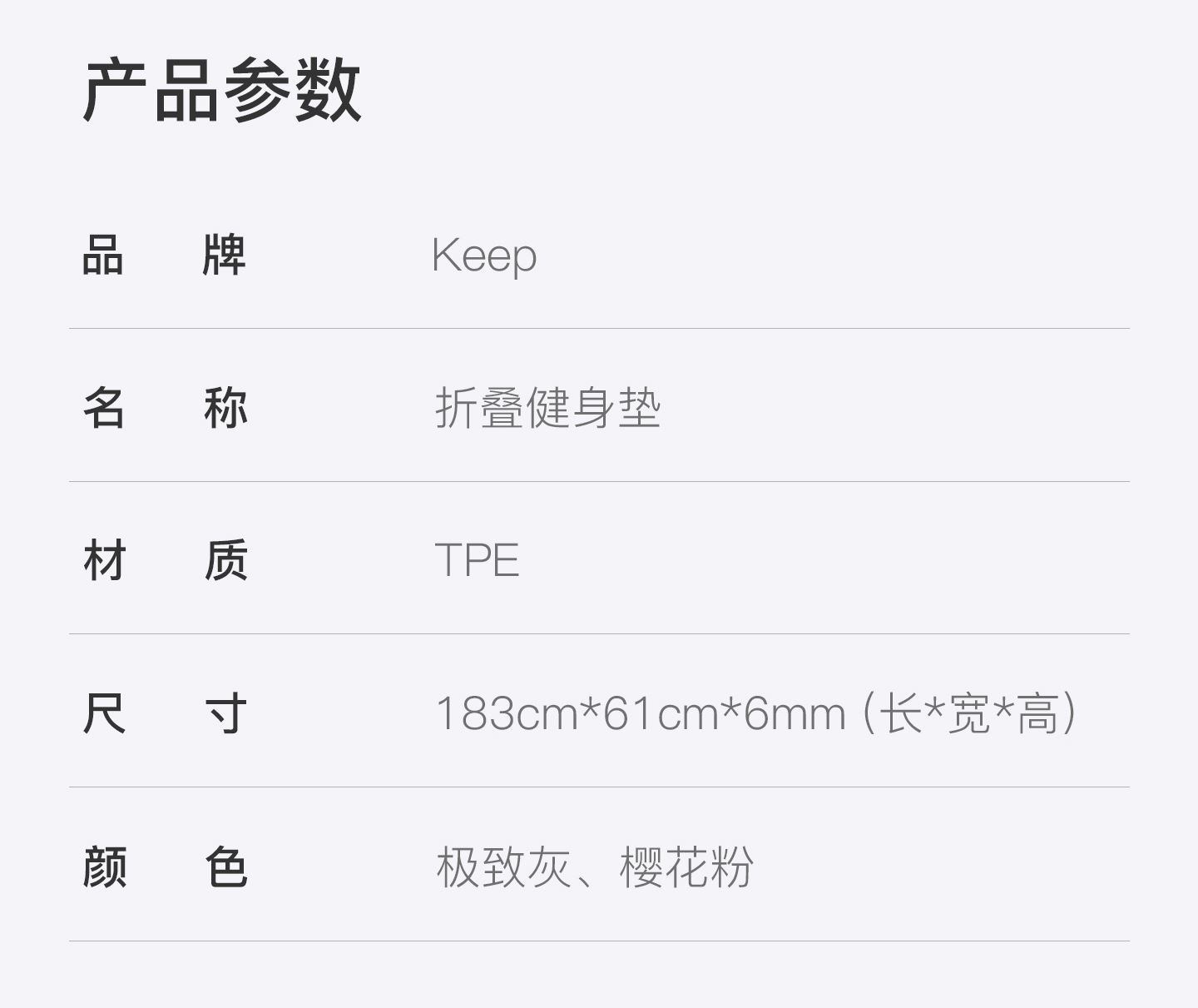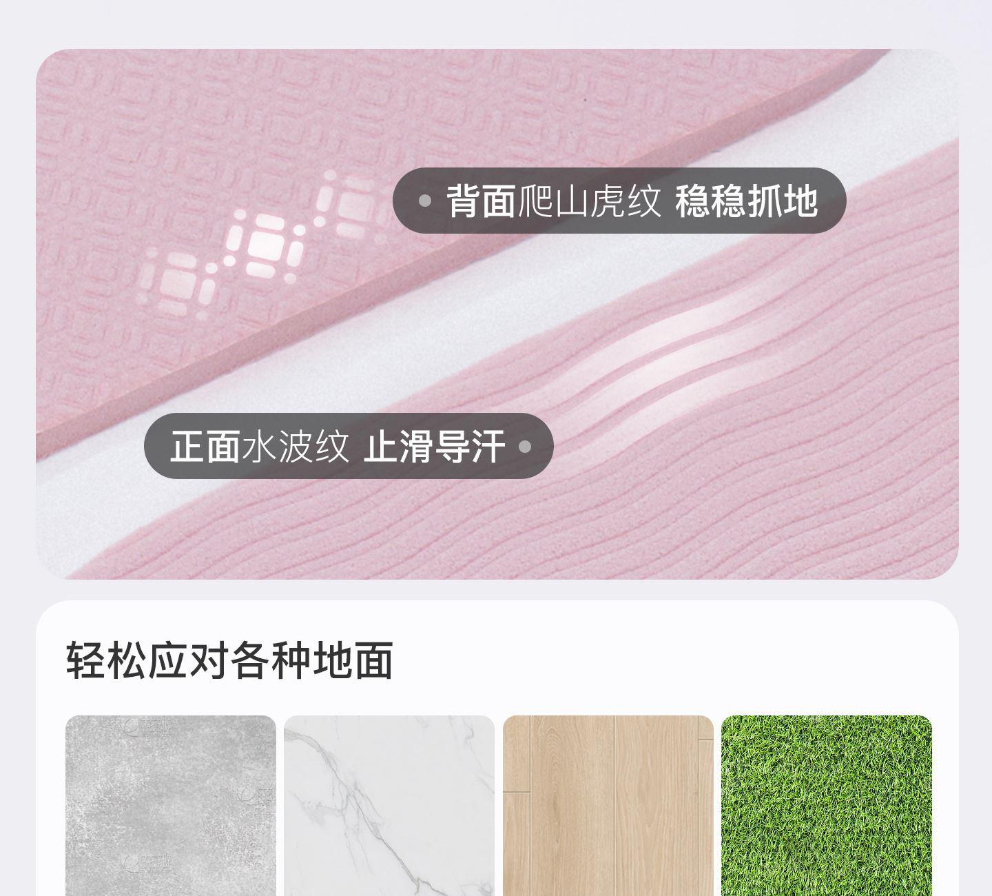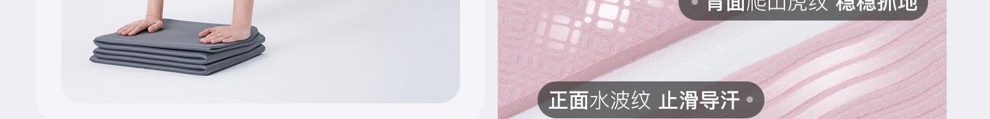材質(zhì):TPE 尺寸:183cm*61cm*6mm(長*寬*高) 顏色: 灰色、粉色 一墊多用多運(yùn)動模式 可折疊設(shè)計便攜收納,節(jié)省37%空間 一甩秒平不卷邊 高密TPE一體發(fā)泡柔軟回彈 雙面防滑紋路訓(xùn)練不位移 經(jīng)久耐用抗撕拉 10W次折疊測試不開裂